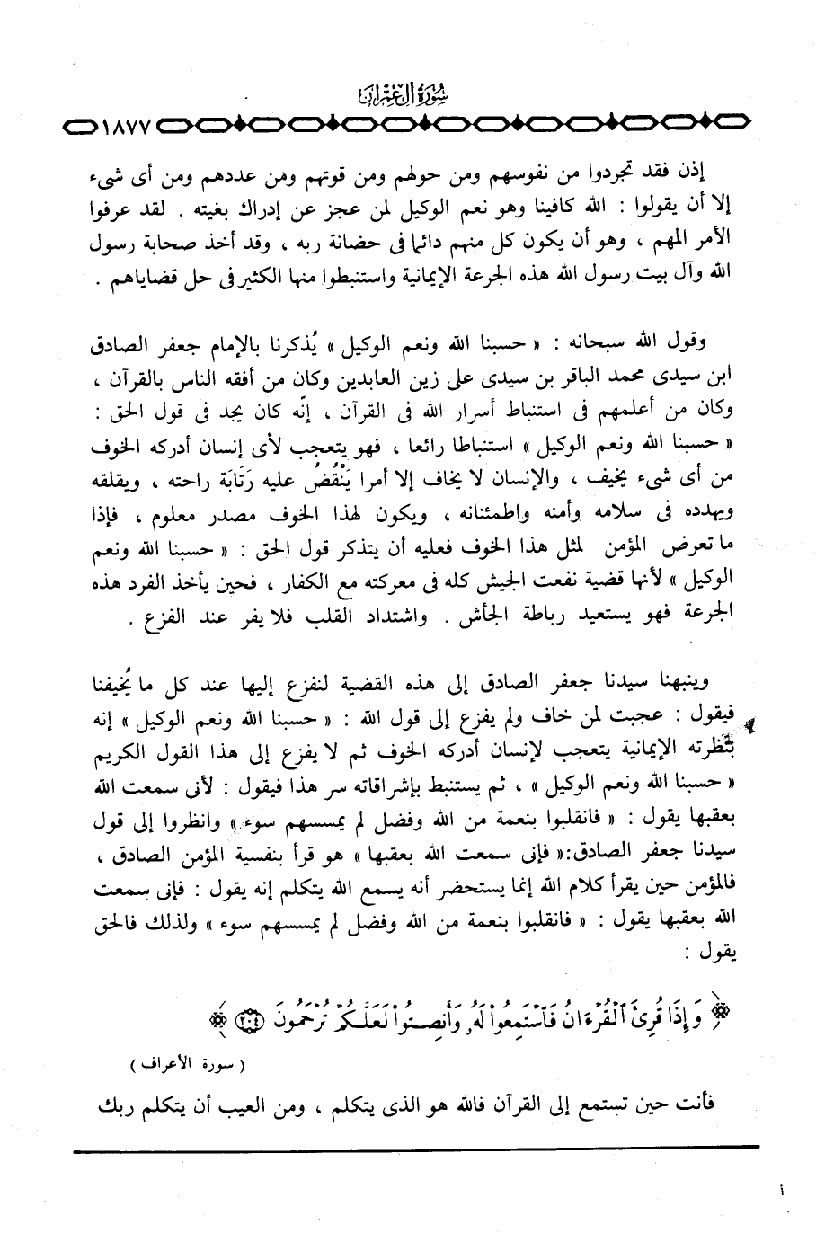 وينبهنا سيدنا جعفر الصادق إلى هذه القضية لنفزع إليها عند كل ما يُخيفنا فيقول: عجبت لمن خاف ولم يفزع إلى قول الله: {حَسْبُنَا الله وَنِعْمَ الوكيل} إنه بنظرته الإيمانية يتعجب لإنسان أدركه الخوف ثم لا يفزع إلى هذا القول الكريم {حَسْبُنَا الله وَنِعْمَ الوكيل} ، ثم يستنبط بإشراقاته سر هذا فيقول: لأني سمعت الله بعقبها يقول: {فانقلبوا بِنِعْمَةٍ مِّنَ الله وَفَضْلٍ لَّمْ يَمْسَسْهُمْ سواء} وانظروا إلى قول سيدنا جعفر الصادق: «فإني سمعت الله بعقبها» هو قرأ بنفسية المؤمن الصادق، فالمؤمن حين يقرأ كلام الله إنما يستحضر أنه يسمع الله يتكلم إنه يقول: فإني سمعت الله بعقبها يقول: {فانقلبوا بِنِعْمَةٍ مِّنَ الله وَفَضْلٍ لَّمْ يَمْسَسْهُمْ سواء} ولذلك فالحق يقول: {وَإِذَا قُرِىءَ القرآن فاستمعوا لَهُ وَأَنصِتُواْ لَعَلَّكُمْ تُرْحَمُونَ} [الأعراف: 204]