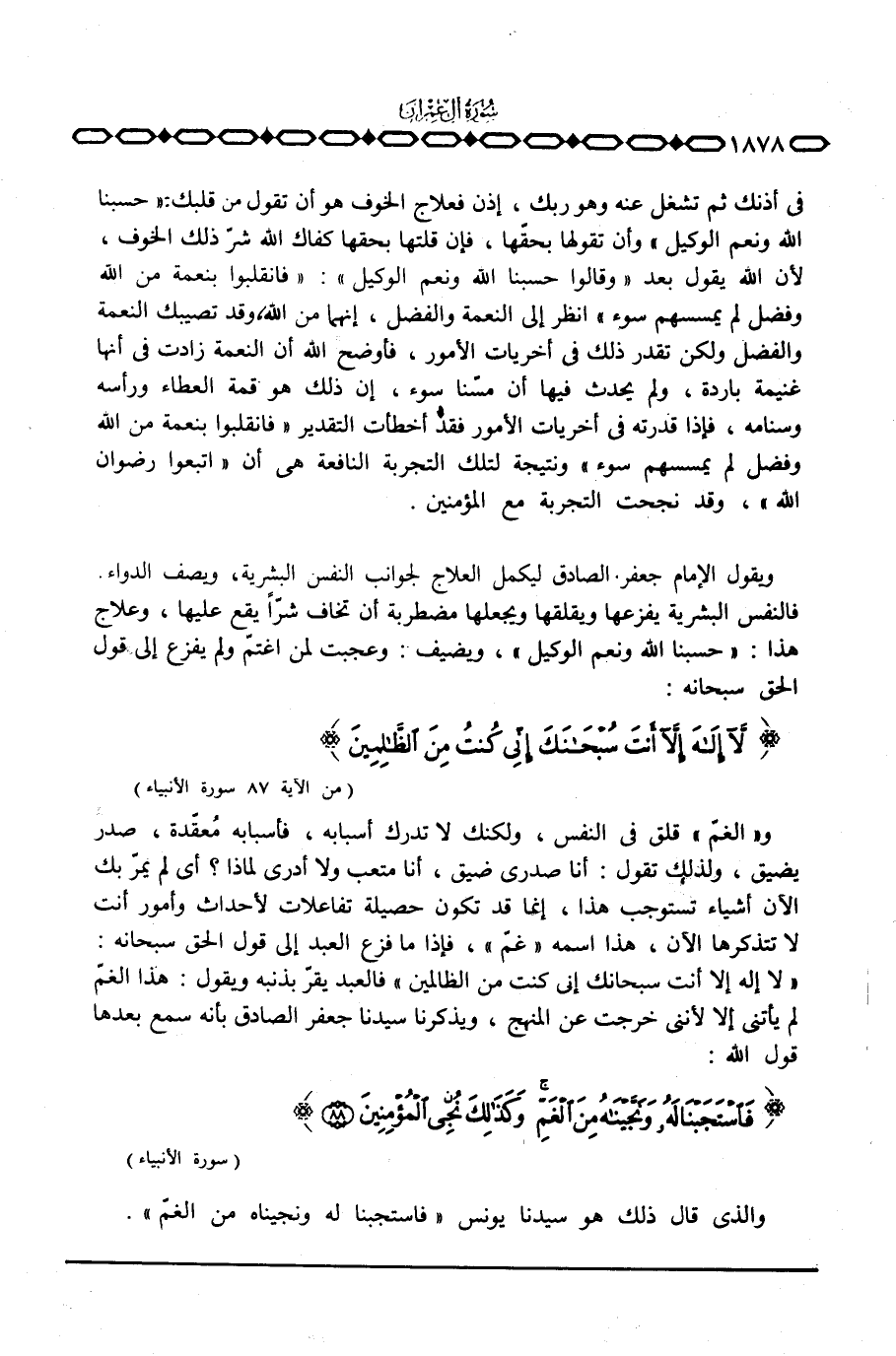 ويقول الإمام جعفر الصادق ليكمل العلاج لجوانب النفس البشرية، ويصف الدواء فالنفس البشرية يفزعها ويقلقها ويجعلها مضطربة أن تخاف شرًّا يقع عليها، وعلاج هذا: {حَسْبُنَا الله وَنِعْمَ الوكيل} ، ويضيف: وعجبت لمن اغتمّ ولم يفزع إلى قول الحق سبحانه: {لاَّ إله إِلاَّ أَنتَ سُبْحَانَكَ إِنِّي كُنتُ مِنَ الظالمين} [الأنبياء: 87]
