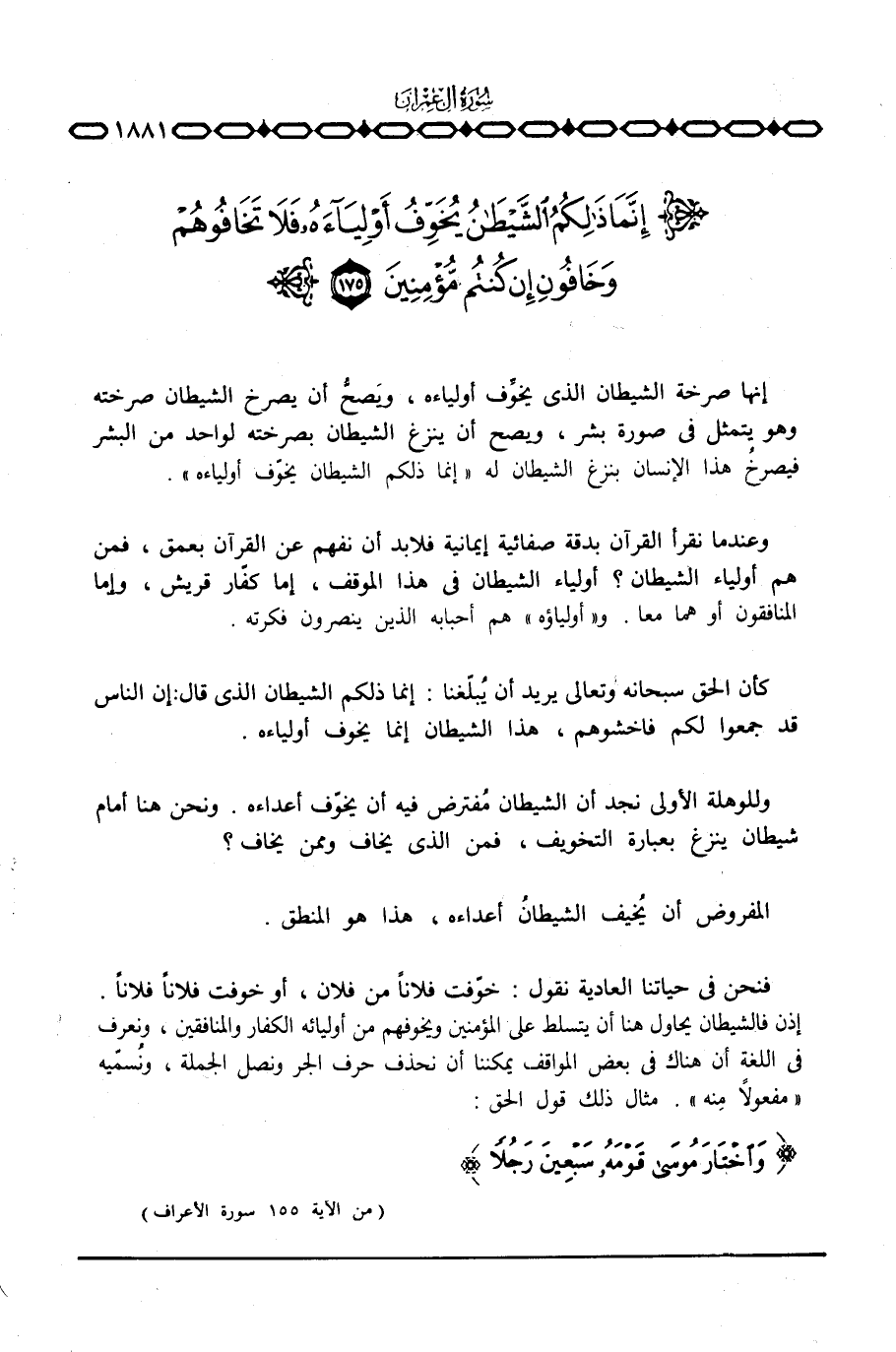 فنحن في حياتنا العادية نقول: خوّفت فلاناً من فلان، أو خوفت فلاناً فلاناً إذن فالشيطان يحاول هنا أن يتسلط على المؤمنين ويخوفهم من أوليائه الكفار والمنافقين، ونعرف في اللغة أن هناك في بعض المواقف يمكننا أن نحذف حرف الجر ونصل الجملة، ونُسمّيه «مفعولاً منه» . مثال ذلك قول الحق: {واختار موسى قَوْمَهُ سَبْعِينَ رَجُلاً} [الأعراف: 155]