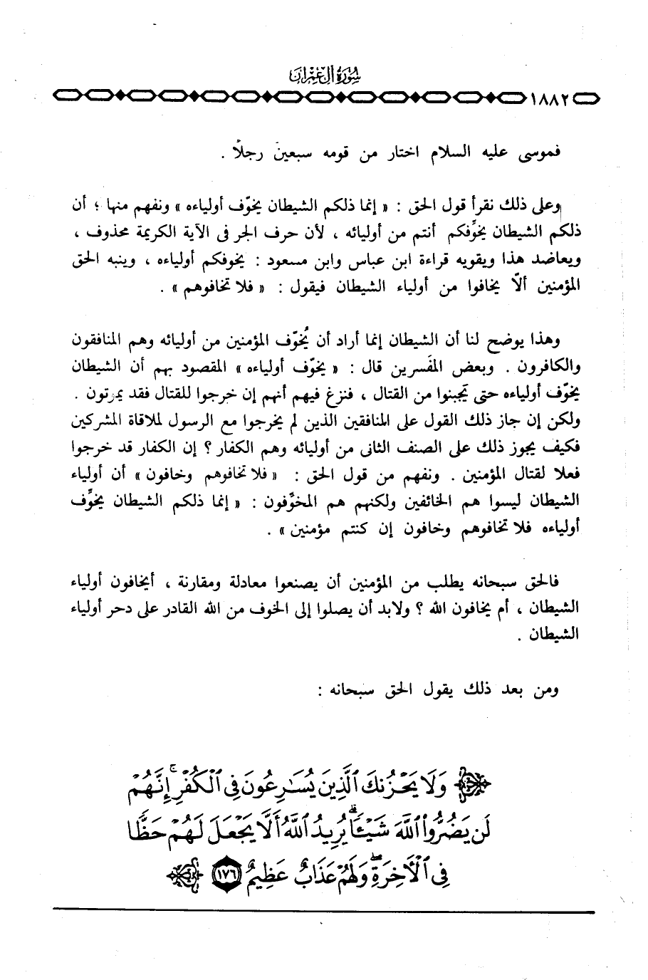وعلى ذلك نقرأ قول الحق: {إِنَّمَا ذلكم الشيطان يُخَوِّفُ أَوْلِيَاءَهُ} ونفهم منها؛ أن ذلكم الشيطان يخوِّفكم أنتم من أوليائه، لأن حرف الجر في الآية الكريمة محذوف، ويعاضد هذا ويقويه قراءة ابن عباس وابن مسعود: يخوفكم أولياءه، وينبه الحق المؤمنين ألاّ يخافوا من أولياء الشيطان فيقول: {فَلاَ تَخَافُوهُمْ} .
