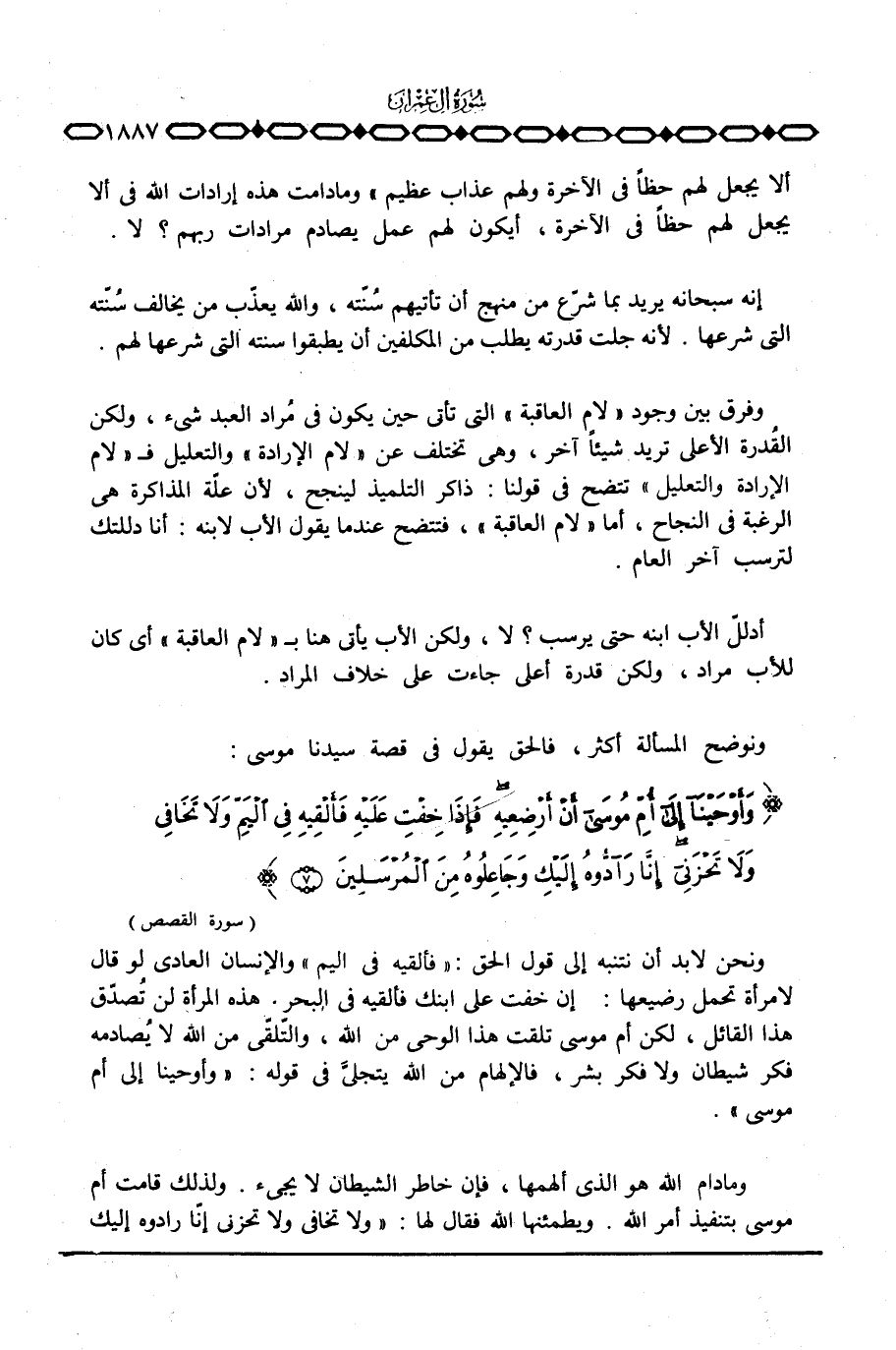وفرق بين وجود «لام العاقبة» التي تأتي حين يكون في مُراد العبد شيء، ولكن القُدرة الأعلى تريد شيئاً آخر، وهي تختلف عن «لام الإرادة» والتعليل ف «لام الإرادة والتعليل» تتضح في قولنا: ذاكر التلميذ لينجح، لأن علّة المذاكرة هي الرغبة في النجاح، أما «لام العاقبة» فتتضح عندما يقول الأب لابنه: أنا دللتك لترسب آخر العام.