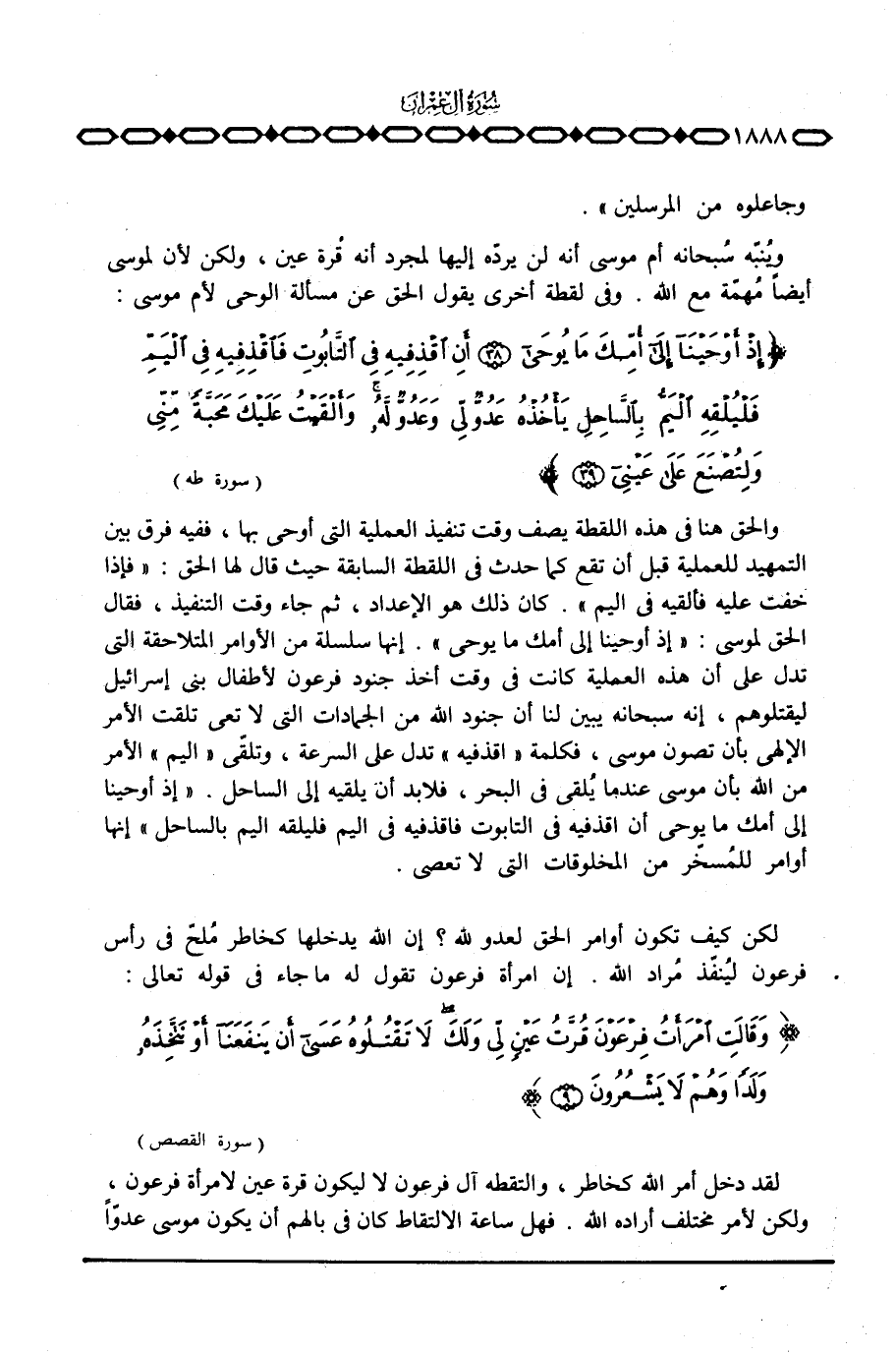 ويُنبّه سُبحانه أم موسى أنه لن يردّه إليها لمجرد أنه قرة عين، ولكن لأن لموسى أيضاً مُهمّة مع الله. وفي لقطة أخرى يقول الحق عن مسألة الوحي لأم موسى: {إِذْ أَوْحَيْنَآ إلى أُمِّكَ مَا يوحى أنِ اقذفيه فِي التابوت فاقذفيه فِي اليم فَلْيُلْقِهِ اليم بالساحل يَأْخُذْهُ عَدُوٌّ لِّي وَعَدُوٌّ لَّهُ وَأَلْقَيْتُ عَلَيْكَ مَحَبَّةً مِّنِّي وَلِتُصْنَعَ على عيني} [طه: 38 - 39]