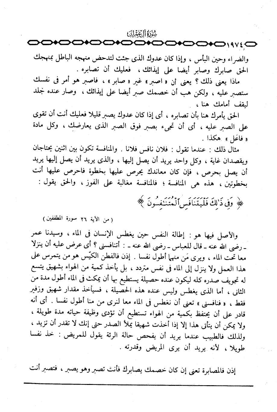 إذن فالفطن الكيّس هو من يتمرس على هذا العمل ولا ينزل إلى الماء في نفس متردد، بل يأخذ كمية من الهواء بشهيق يتسع له تجويف صدره كله ليكون عنده حصيلة يستطيع بها أن يمكث في الماء أطول مدة من الثاني، أما الذي يغطس وليس عنده هذه الحصيلة، فسيأخذ مقدار شهيق وزفير فقط «فنافسني» تعني أن نغطس في الماء معا لنرى من منا أطول نفسا. أي أنه قادر على أن يحتفظ بكمية من الهواء تستطيع أن تؤدي وظيفة حياته مدة طويلة، ولا يمكن أن يتأتى هذا إلا إذا أخذت شهيقاً يملأ الصدر حتى إنك لا تقدر أن تزيد، ولذلك فالطبيب عندما يريد أن يفحص حالة الرئة يقول للمريض: خذ نفساً طويلاً، لأنه يريد أن يرى المريض وقدرته.