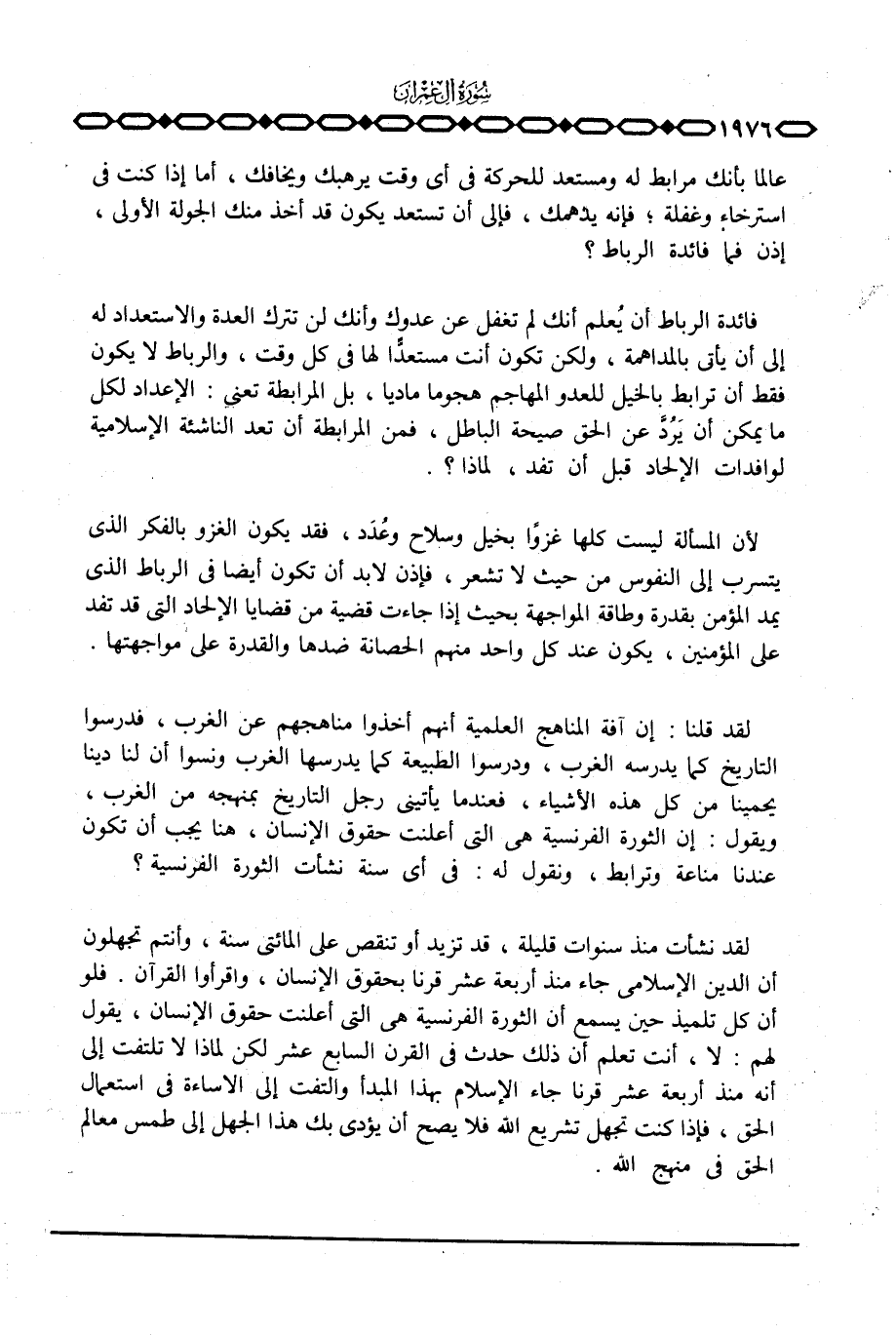 لقد نشأت منذ سنوات قليلة، قد تزيد أو تنقص علىلمائتي سنة، وأنتم تجهلون أن الدين الإسلامي جاء منذ أربعة عشر قرنا بحقوق الإنسان، واقرأوا القرآن. فلو أن كل تلميذ حين يسمع أن الثورة الفرنسية هي التي أعلنت حقوق الإنسان، يقول لهم: لا، أنت تعلم أن ذلك حدث في القرن السابع عشر لكن لماذا لا تلتفت إلى أنه منذ أربعة عشر قرنا جاء الإسلام بهذا المبدأ والتفت إلى الإساءة في استعمال الحق، فإذا كنت تجهل تشريع الله فلا يصح أن يؤدي بك هذا الجهل إلى طمس معالم الحق في منهج الله.