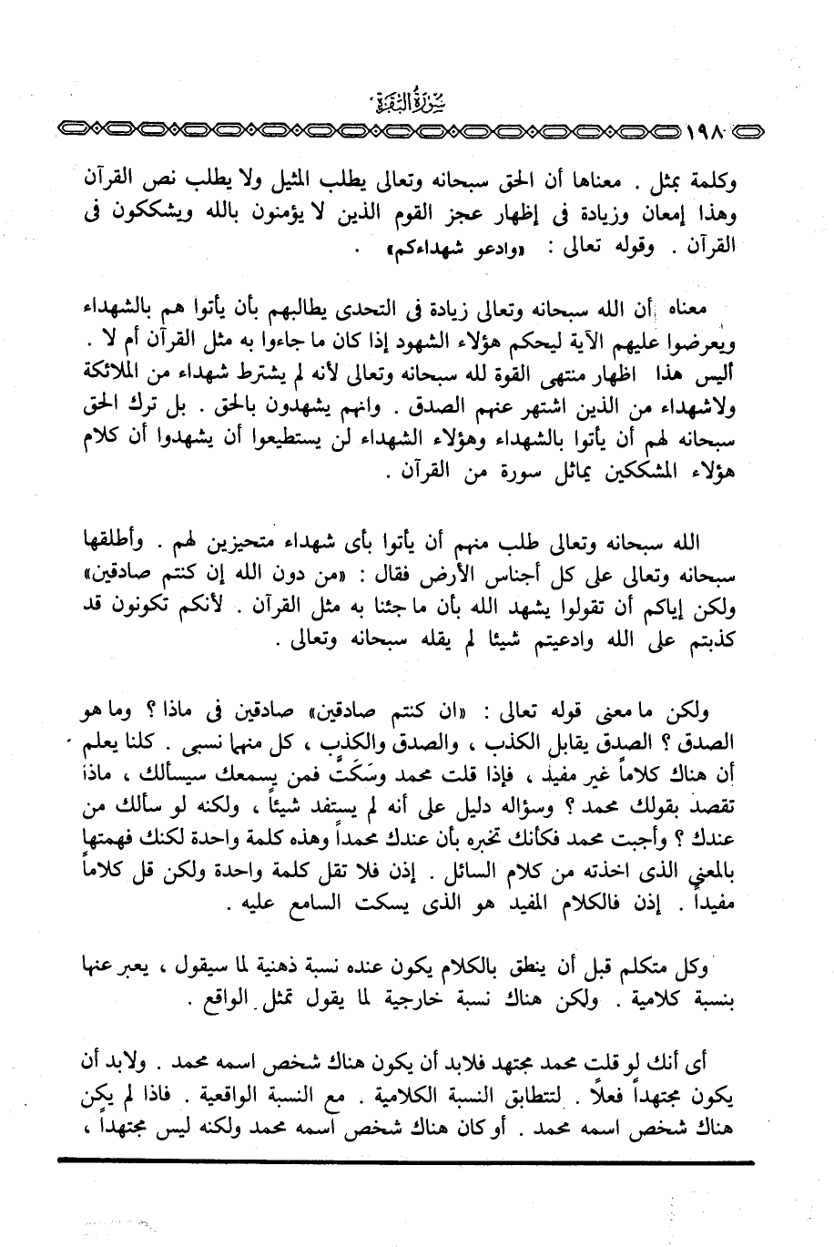 ولكن ما معنى قوله تعالى: {إِنْ كُنْتُمْ صَادِقِينَ} صادقين في ماذا؟ وما هو الصدق؟ الصدق يقابل الكذب، والصدق والكذب، كل منهما نسبي. كلنا يعلم أن هناك كلاماً غير مفيد، فإذا قلت محمد وسَكَتَّ فمن يسمعك سيسألك، ماذا تقصد بقولك محمد؟ وسؤاله دليل على أنه لم يستفد شيئاً، ولكنه لو سألك من عندك؟ وأجبت محمد فكأنك تخبره بأن عندك محمداً وهذه كلمة واحدة لكنك فهمتها بالمعنى الذي أخذته من كلام السائل. إذن فلا تقل كلمة واحدة ولكن قل كلاماً مفيداً. إذن فالكلام المفيد هو الذي يسكت السامع عليه.