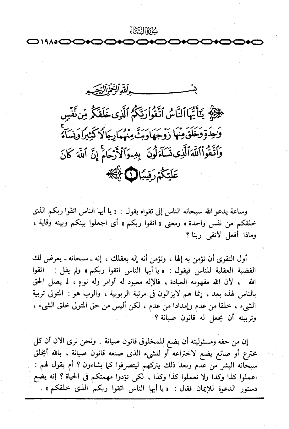 إن من حقه ومسئوليته أن يضع للمخلوق قانون صيانة. ونحن نرى الآن أن كل مخترع أو صانع يضع لاختراعه أو للشىء الذي صنعه قانون صيانة، بالله أيخلق سبحانه البشر من عدم وبعد ذلك يتركهم ليتصرفوا كما يشاؤون؟ أم يقول لهم: اعملوا كذا وكذا ولا تعملوا كذا وكذا، لكى تؤدوا مهمتكم فى الحياة؟ إنه يضع دستور الدعوة للإيمان فقال: {ياأيها الناس اتقوا رَبَّكُمُ الذي خَلَقَكُمْ}