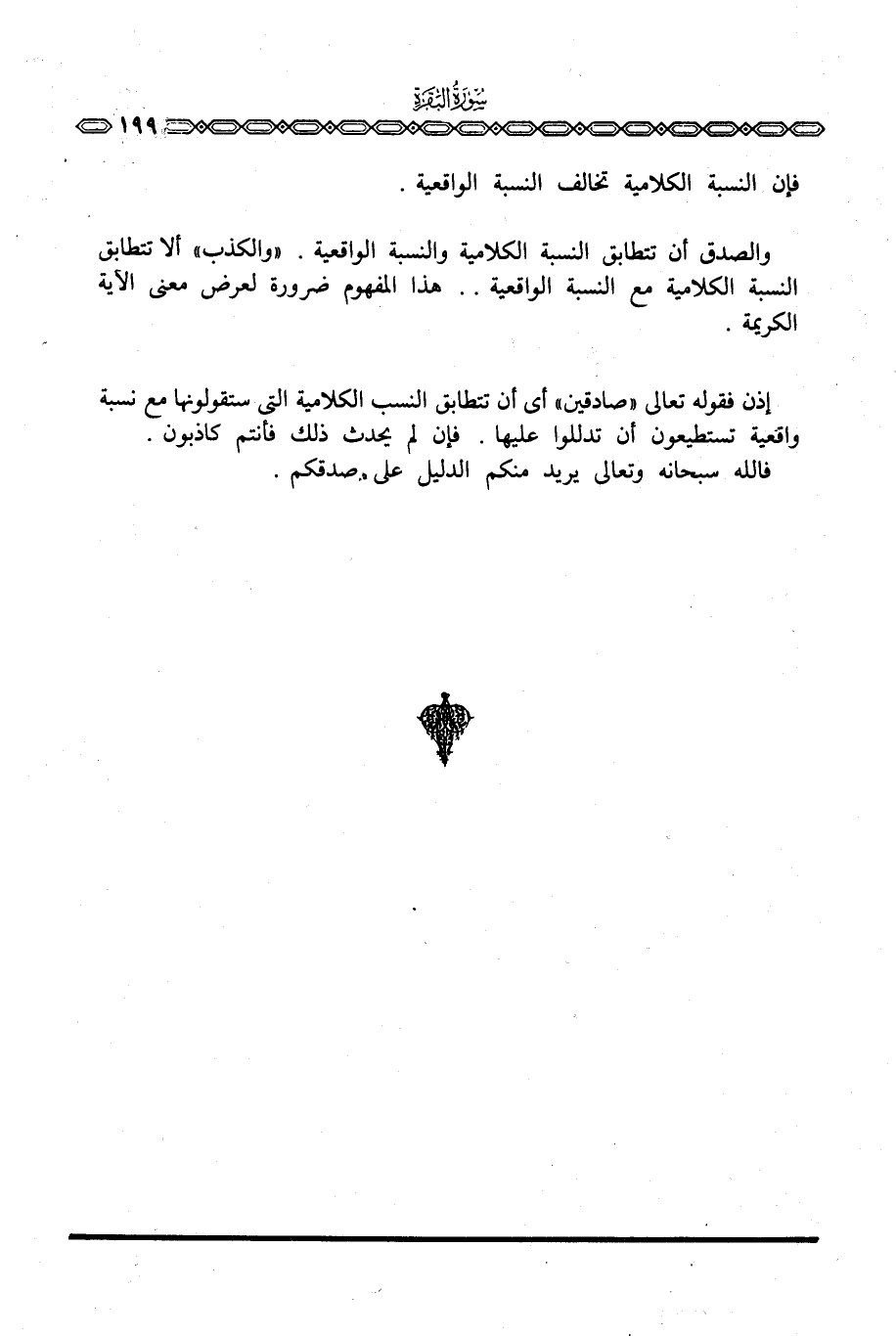 إذن فقوله تعالى «صادقين» أي أن تتطابق النسبة الكلامية التي ستقولونها مع نسبة واقعية تستطيعون أن تدللوا عليها. فإن لم يحدث ذلك فأنتم كاذبون.