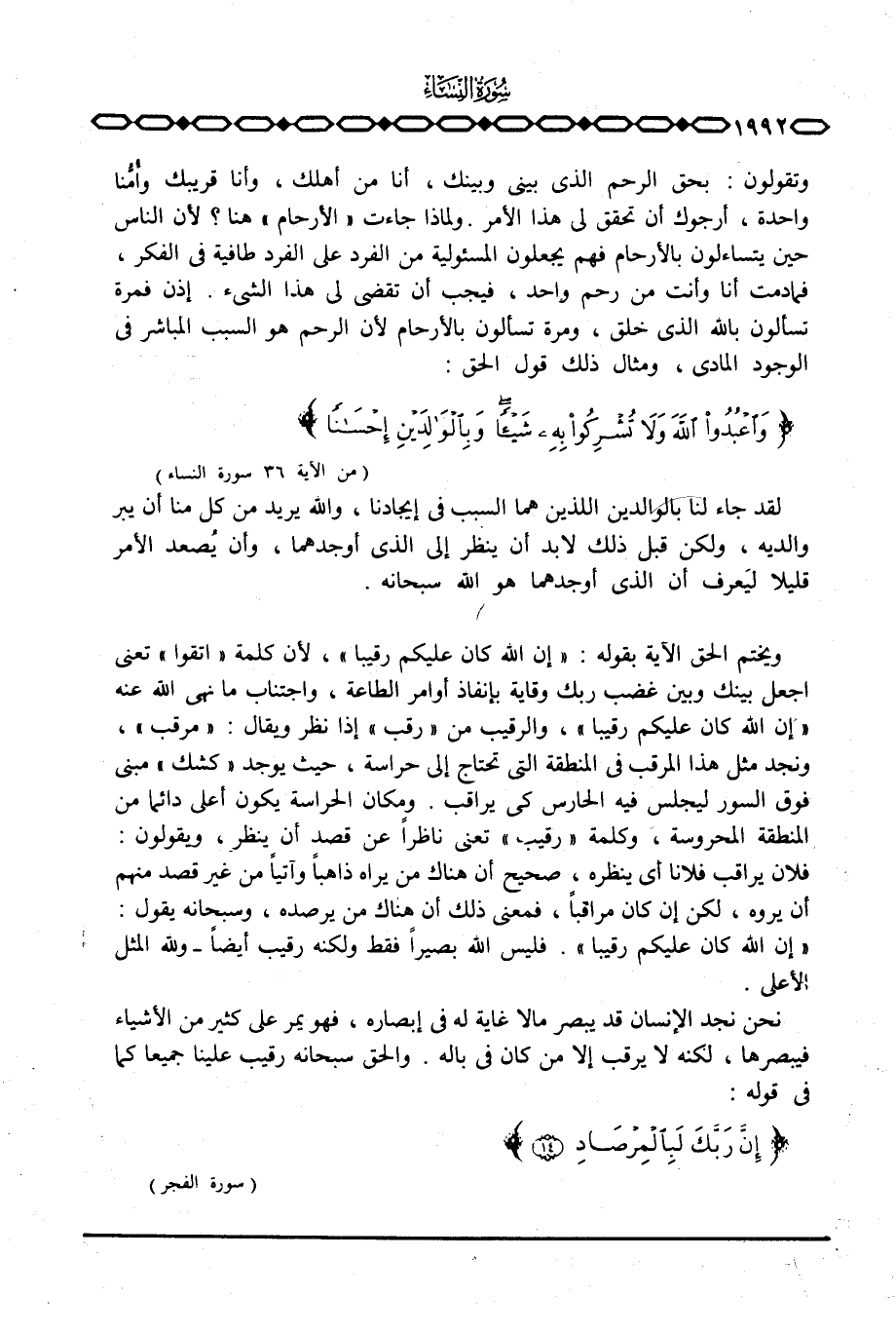 وتقولون: بحق الرحم الذي بيني وبينك، أنا من أهلك، وأنا قريبك وأمُّنا واحدة، أرجوك أن تحقق لي هذا الأمر. ولماذا جاءت {الأرحام} هنا؟ لأن الناس حين يتساءلون بالأرحام فهم يجعلون المسئولية من الفرد على الفرد طافية في الفكر، فمادمت أنا وأنت من رحم واحد، فيجب أن تقضى لي هذا الشىء. إذن فمرة تسألون بالله الذي خلق، ومرة تسألون بالأرحام لأن الرحم هو السبب المباشر في الوجود المادي، ومثال ذلك قول الحق: