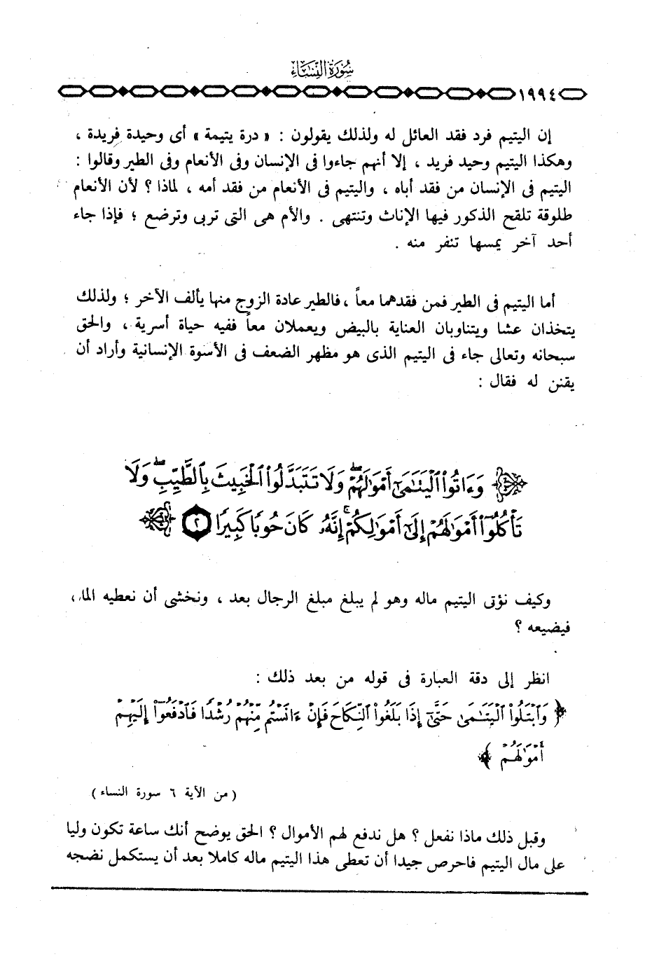 إن اليتيم فرد فقد العائل له ولذلك يقولون: «درة يتيمة» أى وحيدة فريدة، وهكذا اليتيم وحيد فريد، إلا أنهم جاءوا فى الإنسان وفى الأنعام وفى الطير وقالوا: اليتيم فى الإنسان من فقد أباه، واليتيم فى الأنعام من فقد أمه، لماذا؟ لأن الأنعام طلوقة تلقح الذكور فيها الإناث وتنتهى. والأم هى التى تربى وترضع؛ فإذا جاء أحد آخر يمسها تنفر منه.