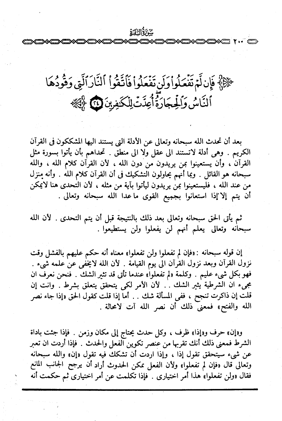 إن قوله سبحانه: {فَإِن لَّمْ تَفْعَلُواْ وَلَن تَفْعَلُواْ} معناه أنه حكم عليهم بالفشل وقت نزول القرآن وبعد نزول القرآن إلي يوم القيامة. لأن الله لا يخفى عن علمه شيء. فهو بكل شيء عليم. وكلمة «لم تفعلوا» عندما تأتي قد تثير الشك. فنحن نعرف أن مجيء إن الشرطية يثير الشك. . لأن الأمر لكي يتحقق يتعلق بشرط. وأنت إن قلت إن ذاكرت تنجح، ففي المسألة شك. . أما إذا قلت كقول الحق {إِذَا جَآءَ نَصْرُ الله والفتح} فمعنى ذلك أن نصر الله آت لا محالة.