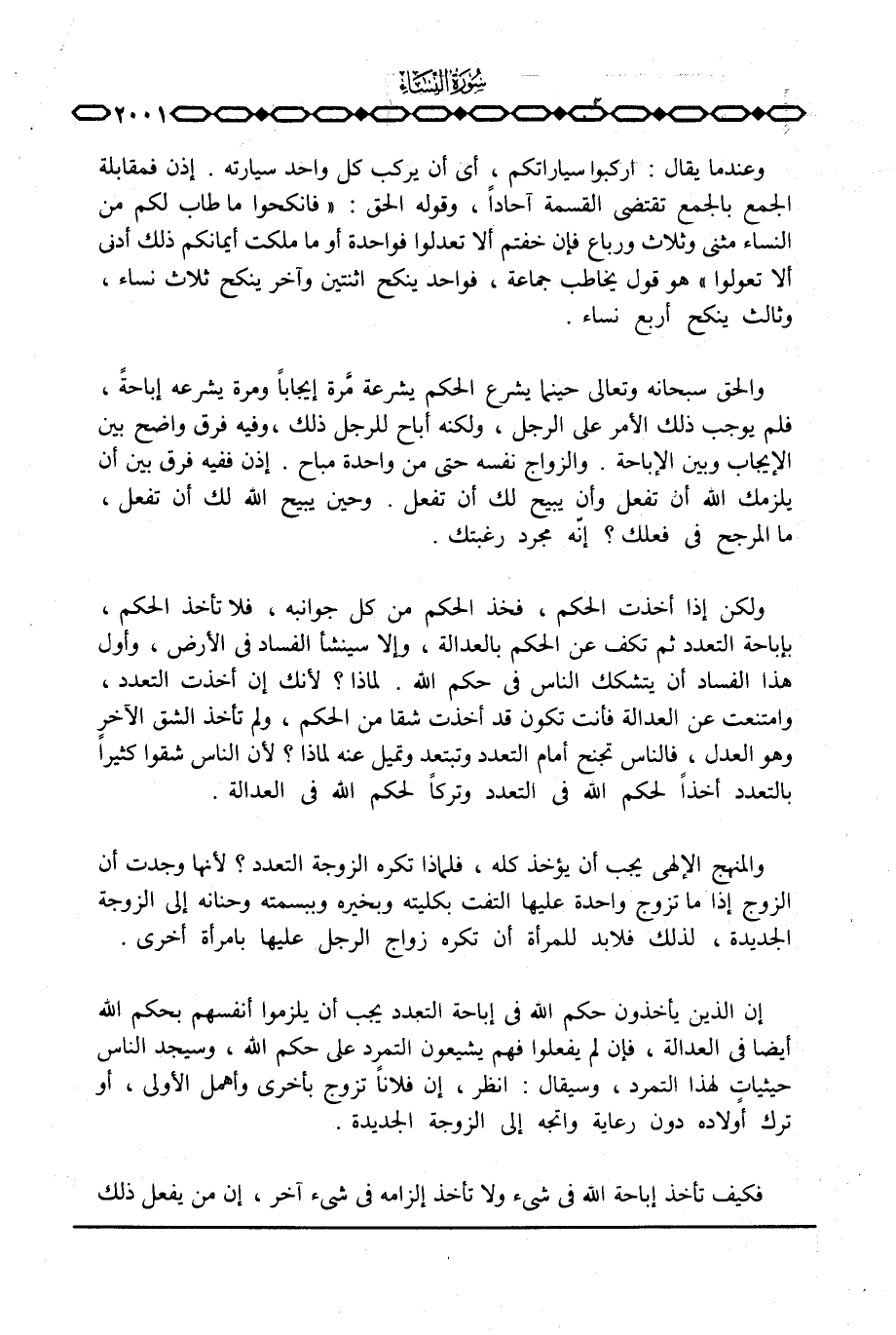 ولكن إذا أخذت الحكم، فخذ الحكم من كل جوانبه، فلا تأخذ الحكم، بإباحة التعدد ثم تكف عن الحكم بالعدالة، وإلا سينشأ الفساد في الأرض، وأول هذا الفساد أن يتشكك الناس في حكم الله. لماذا؟ لأنك إن أخذت التعدد، وامتنعت عن العدالة فأنت تكون قد أخذت شقا من الحكم، ولم تأخذ الشق الآخر وهو العدل، فالناس تجنح أمام التعدد وتبتعد وتميل عنه لماذا؟ لأن الناس شقوا كثيرا بالتعدد أخذا لحكم الله في التعدد وتركا لحكم الله في العدالة.