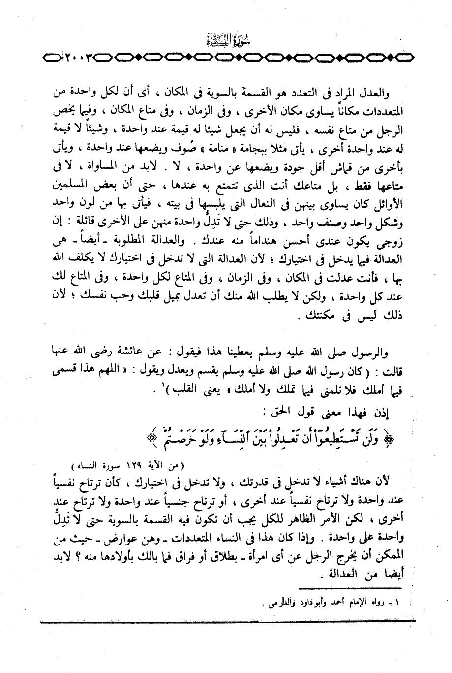 والرسول صَلَّى اللَّهُ عَلَيْهِ وَسَلَّم َ يعطينا هذا فيقول: عن عائشة رَضِيَ اللَّهُ عَنْها قالت: «كان رسول الله صَلَّى اللَّهُ عَلَيْهِ وَسَلَّم َ يقسم ويعدل ويقول:» اللهم هذا قسمي فيما أملك فلا تلمني فيما تملك ولا أملك «يعني القلب» .