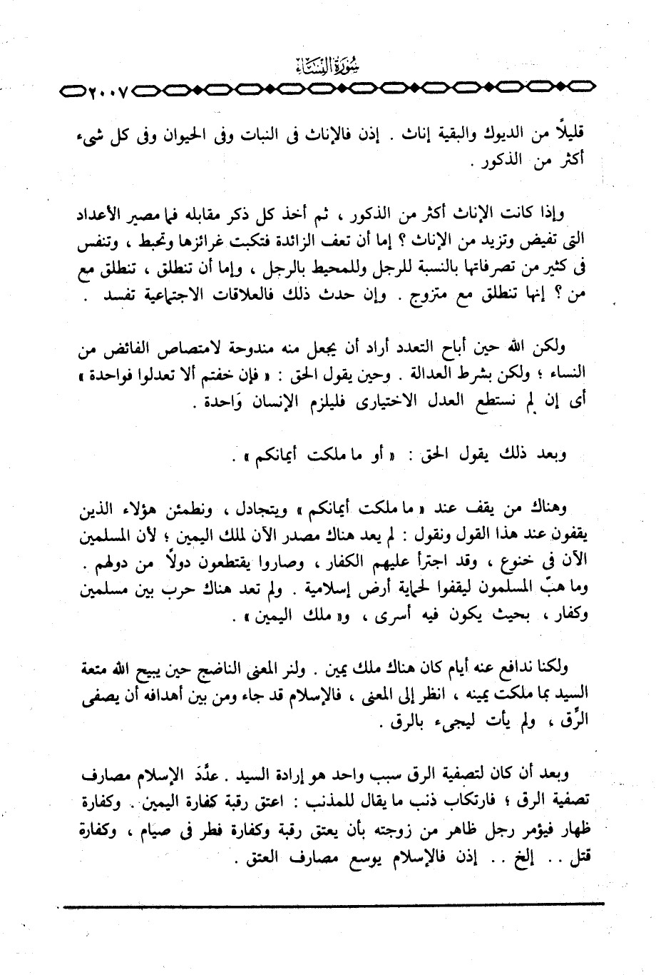 ولكنا ندافع عنه أيام كان هناك ملك يمين. ولنر المعنى الناضج حين يبيح الله متعة السيد بما ملكت يمينه، انظر إلى المعنى، فالإسلام قد جاء ومن بين أهدافه أن يصفي الرقّ، ولم يأت ليجىء بالرق.