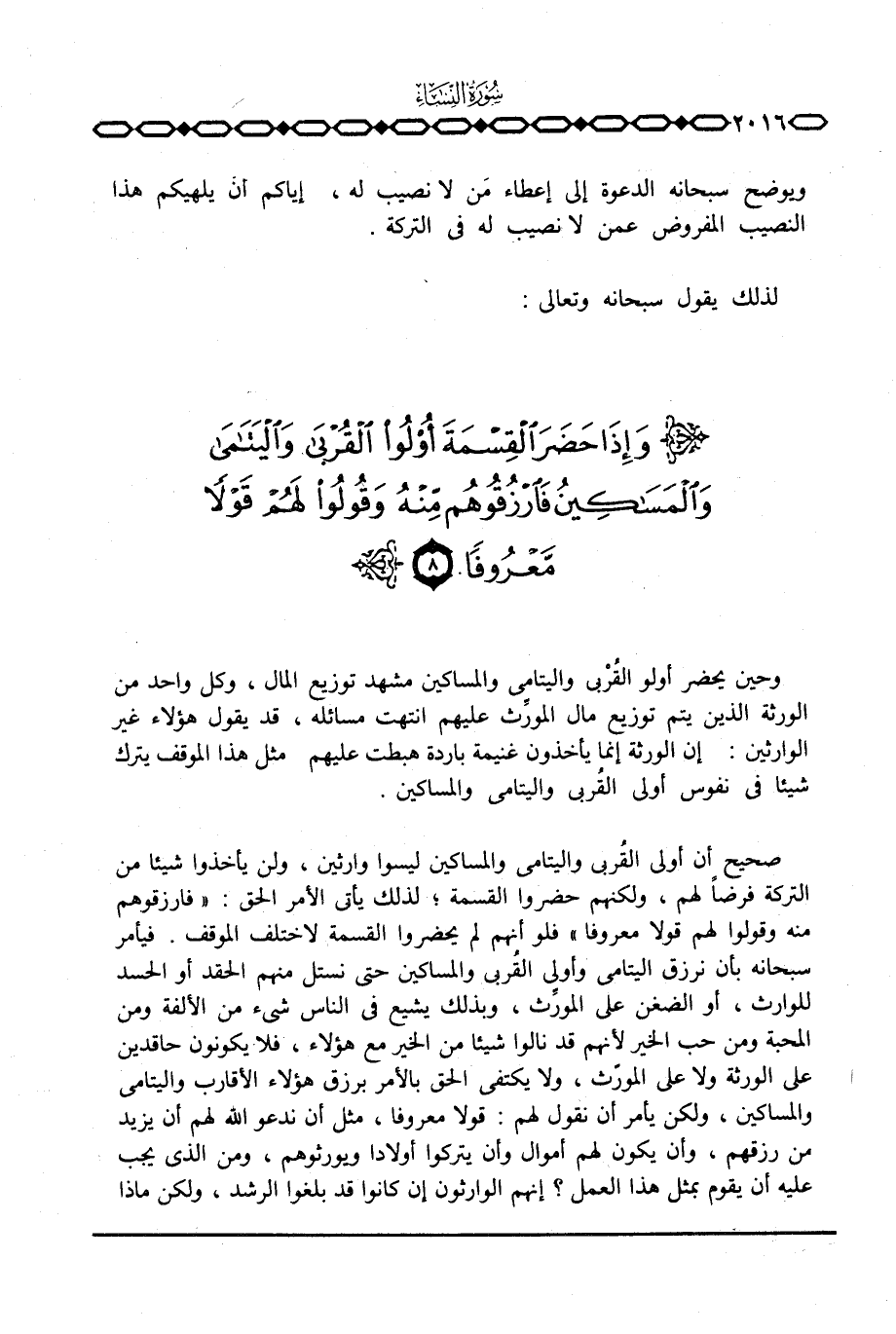 ويوضح سبحانه الدعوة إلى إعطاء من لا نصيب له، إياكم أن يلهيكم هذا النصيب المفروض عمن لا نصيب له في التركة.