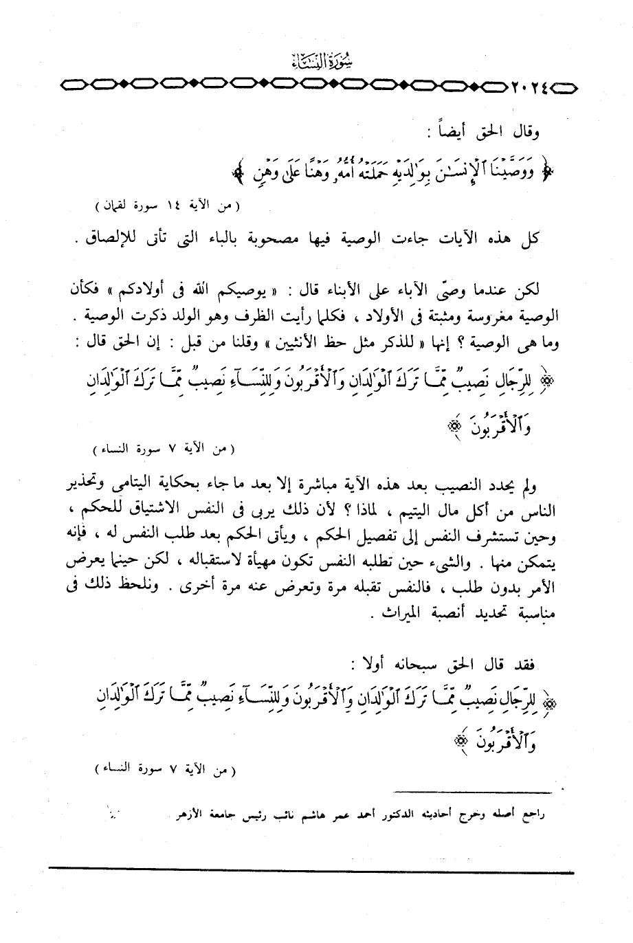 فقد قال الحق سبحانه أولا: {لرِّجَالِ نَصيِبٌ مِّمَّا تَرَكَ الوالدان والأقربون وَلِلنِّسَآءِ نَصِيبٌ مِّمَّا تَرَكَ الوالدان والأقربون} [النساء: 7]