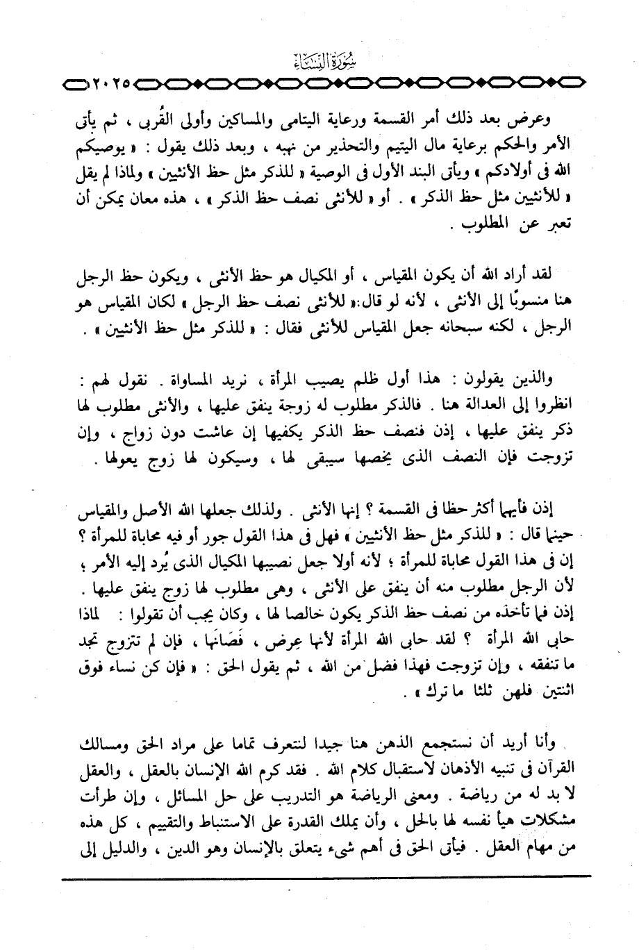 والذين يقولون: هذا أول ظلم يصيب المرأة، نريد المساواة. نقول لهم: انظروا إلى العدالة هنا. فالذكر مطلوب له زوجة ينفق عليها، والأنثى مطلوب لها ذكر ينفق عليها، إذن فنصف حظ الذكر يكفيها إن عاشت دون زواج، وإن تزوجت فإن النصف الذي يخصها سيبقى لها، وسيكون لها زوج يعولها.
