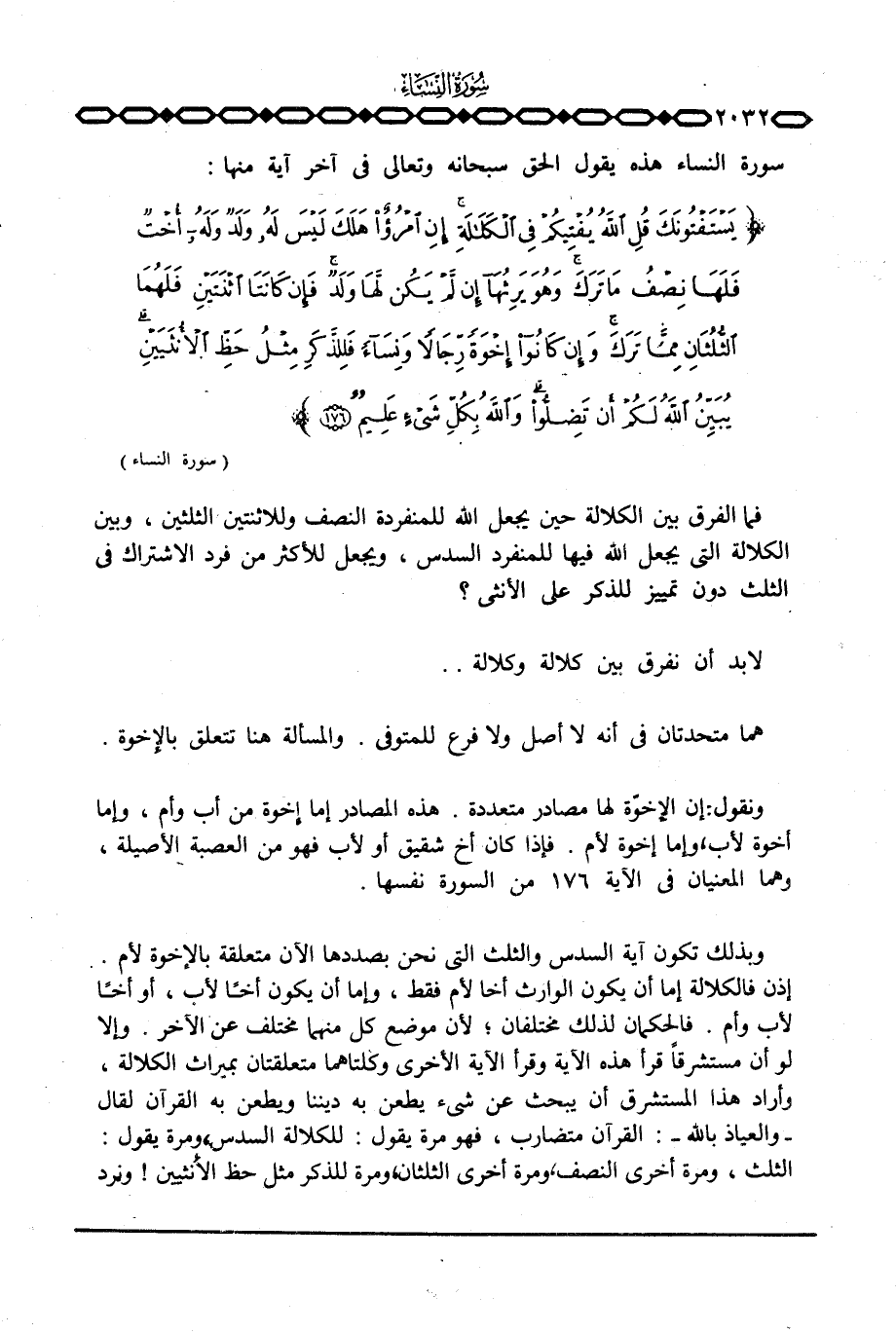 سورة النساء هذه يقول الحق سبحانه وتعالى في آخر آية منها: {يَسْتَفْتُونَكَ قُلِ الله يُفْتِيكُمْ فِي الكلالة إِن امرؤ هَلَكَ لَيْسَ لَهُ وَلَدٌ وَلَهُ أُخْتٌ فَلَهَا نِصْفُ مَا تَرَكَ وَهُوَ يَرِثُهَآ إِن لَّمْ يَكُنْ لَّهَآ وَلَدٌ فَإِن كَانَتَا اثنتين فَلَهُمَا الثلثان مِمَّا تَرَكَ وَإِن كانوا إِخْوَةً رِّجَالاً وَنِسَآءً فَلِلذَّكَرِ مِثْلُ حَظِّ الأنثيين يُبَيِّنُ الله لَكُمْ أَن تَضِلُّواْ والله بِكُلِّ شَيْءٍ عَلِيمٌ}