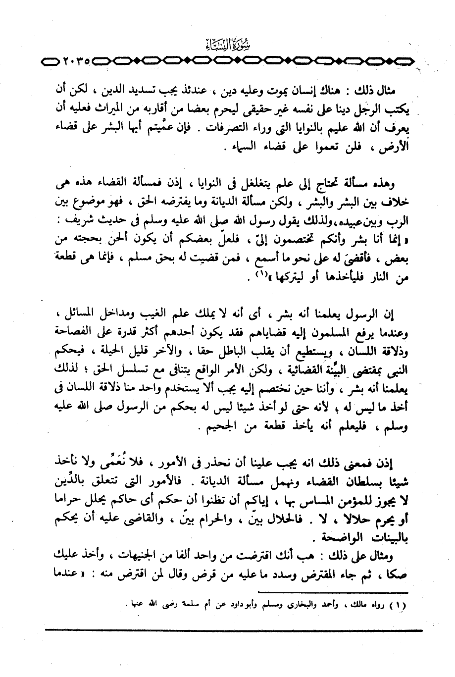 وهذه مسألة تحتاج إلى علم يتغلغل في النوايا، إذن فمسألة القضاء هذه هي خلاف بين البشر والبشر، ولكن مسألة الديانة وما يفترضه الحق، فهو موضوع بين الرب وبين عبيده، ولذلك يقول رسول الله صَلَّى اللَّهُ عَلَيْهِ وَسَلَّم َ في حديث شريف: «إنما أنا بشر وأنكم تختصمون إليّ، فلعلّ بعضكم أن يكون ألحن بحجته من بعض، فأقضى له على نحو ما أسمع، فمن قضيت له بحق مسلم، فإنما هي قطعة من النار فليأخذها أو ليتركها» .