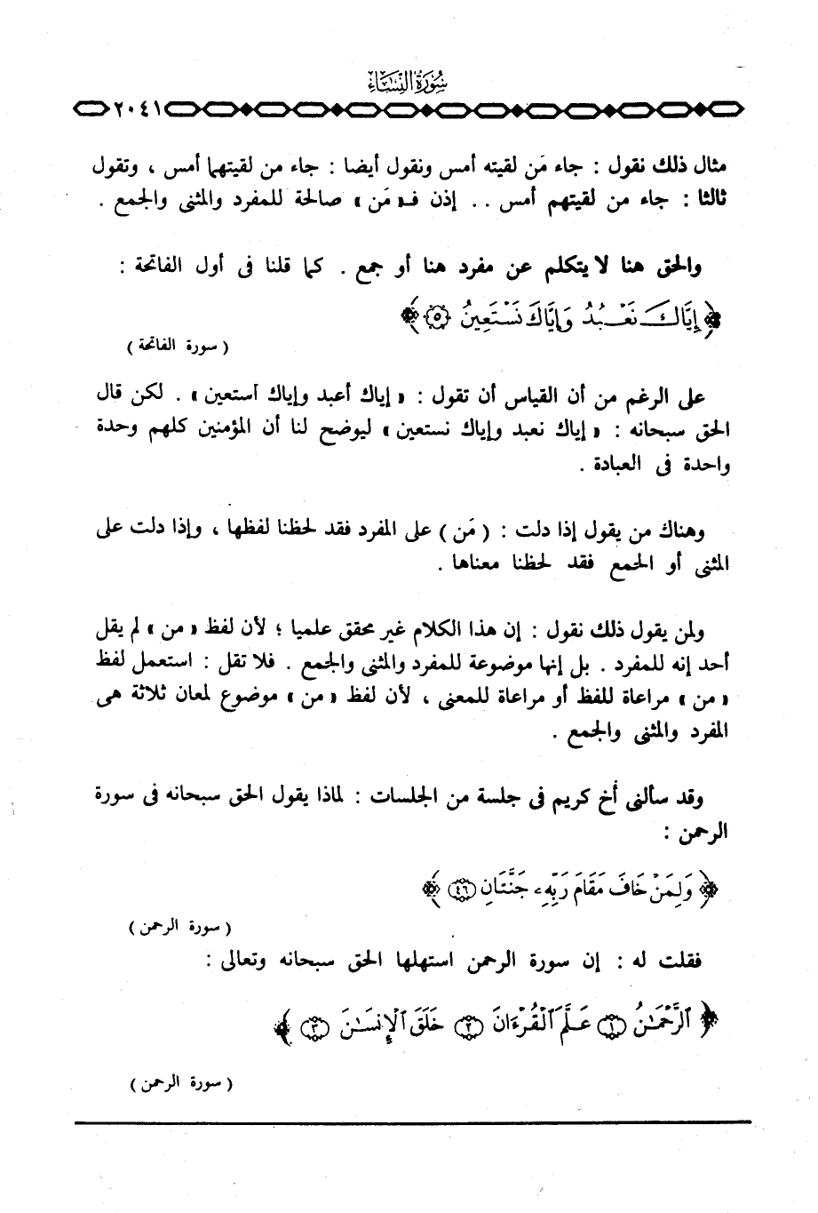 ولمن يقول ذلك نقول: إن هذا الكلام غير محقق علميا؛ لأن لفظ «من» لم يقل أحد إنه للمفرد.
