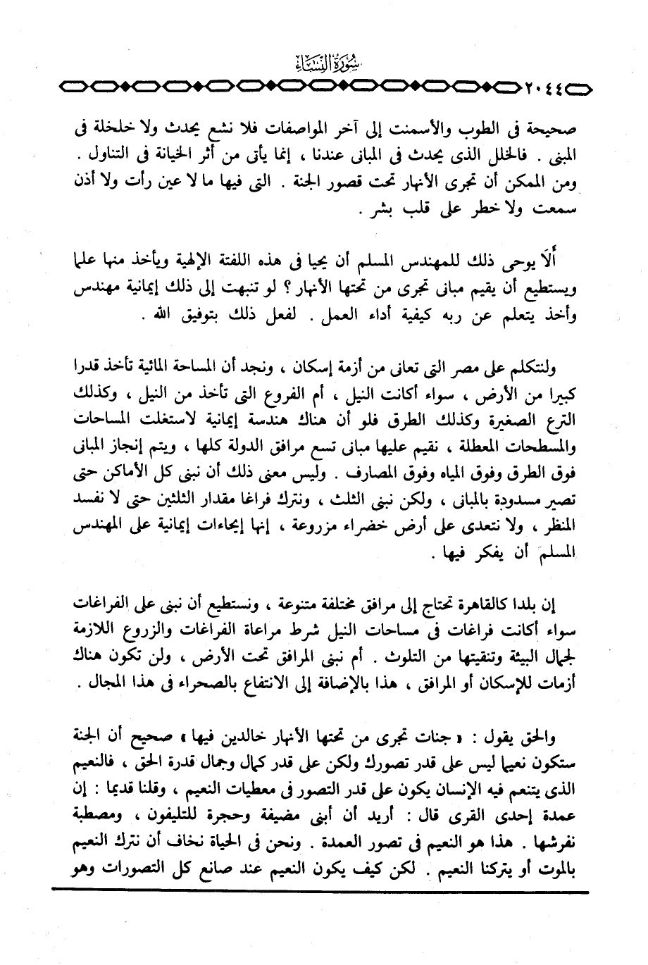 ولنتكلم على مصر التي تعاني من أزمة إسكان، ونجد أن المساحة المائية تأخذ قدرا كبيرا من الأرض، سواء أكانت النيل، أم الفروع التي تأخذ من النيل، وكذلك الترع الصغيرة وكذلك الطرق فلو أن هناك هندسة إيمانية لاستغلت المساحات والمسطحات المعطلة، نقيم عليها مباني تسع مرافق الدولة كلها، ويتم إنجاز المباني فوق الطرق وفوق المياه وفوق المصارف. وليس معنى ذلك أن نبني كل الأماكن حتى تصير مسدودة بالمباني، ولكن نبني الثلث، ونترك فراغا مقدار الثلثين حتى لا نفسد المنظر، ولا نتعدى على أرض خضراء مزروعة، إنها إيحاءات إيمانية على المهندس المسلم أن يفكر فيها.