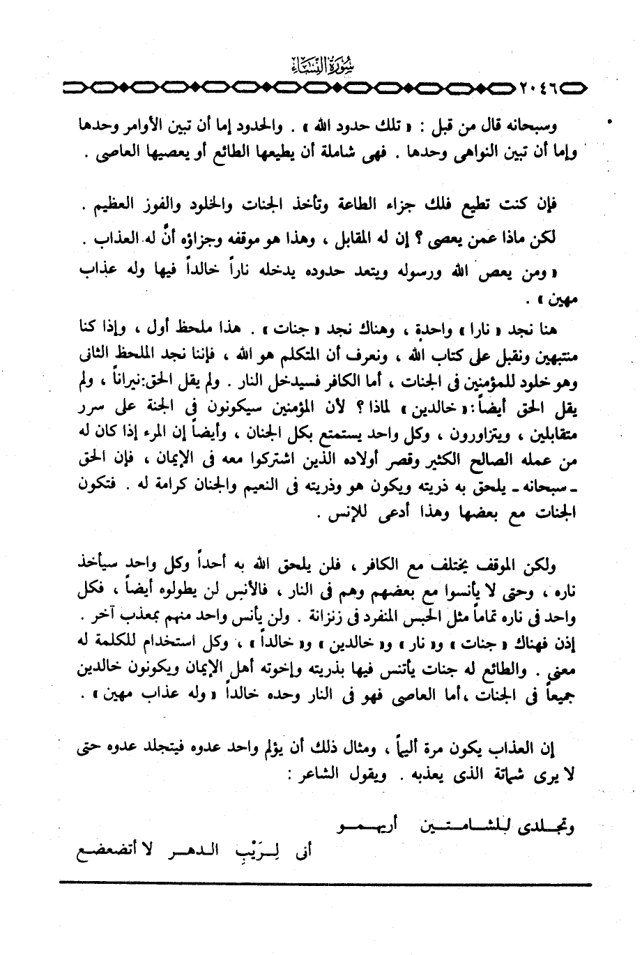 فإن كنت تطيع فلك جزاء الطاعة وتأخذ الجنات والخلود والفوز العظيم. لكن ماذا عمن يعصي؟ إن له المقابل، وهذا هو موقفه وجزاؤه أن له العذاب. {وَمَن يَعْصِ الله وَرَسُولَهُ وَيَتَعَدَّ حُدُودَهُ يُدْخِلْهُ نَاراً خَالِداً فِيهَا وَلَهُ عَذَابٌ مُّهِينٌ} هنا نجد {نَاراً} واحدة، وهناك نجد {جَنَّاتٍ} . هذا ملحظ أول، وإذا كنا منتبهين ونقبل على كتاب الله، ونعرف أن المتكلم هو الله، فإننا نجد الملحظ الثاني وهو خلود للمؤمنين في الجنات، أما الكافر فسيدخل النار. ولم يقل الحق نيرانا، ولم يقل الحق أيضا: «خالدين» لماذا؟ لأن المؤمنين سيكونون في الجنة على سرر متقابلين، ويتزاورون، وكل واحد يستمتع بكل الجنان، وأيضا إن المرء إذا كان له من عمله الصالح الكثير وقصر أولاده الذين اشتركوا معه في الإيمان، فإن الحق - سبحانه - يلحق به ذريته ويكون هو وذريته في النعيم والجنان كرامة له. فتكون الجنات مع بعضها وهذا أدعى للإنس.