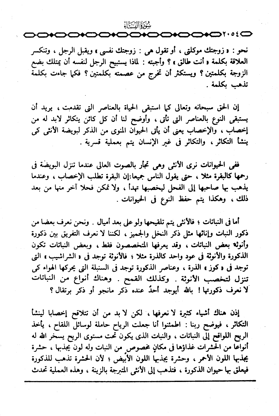 أما في النباتات؛ فالأنثى يتم تلقيحها ولو على بعد أميال. ونحن نعرف بعضا من ذكور النبات وإناثها مثل ذكر النخل والجميز، لكننا لا نعرف التفريق بين ذكورة وأنوثة بعض النباتات، وقد يعرفها المتخصصون فقط، وبعض النباتات تكون الذكورة والأنوثة في عود واحد كالذرة مثلا؛ فالأنوثة توجد في «الشراشيب» التي توجد في «كوز» الذرة، وعناصر الذكورة توجد في السنبلة التي يحركها الهواء كي تنزل لتخصب الأنوثة، وكذلك القمح.