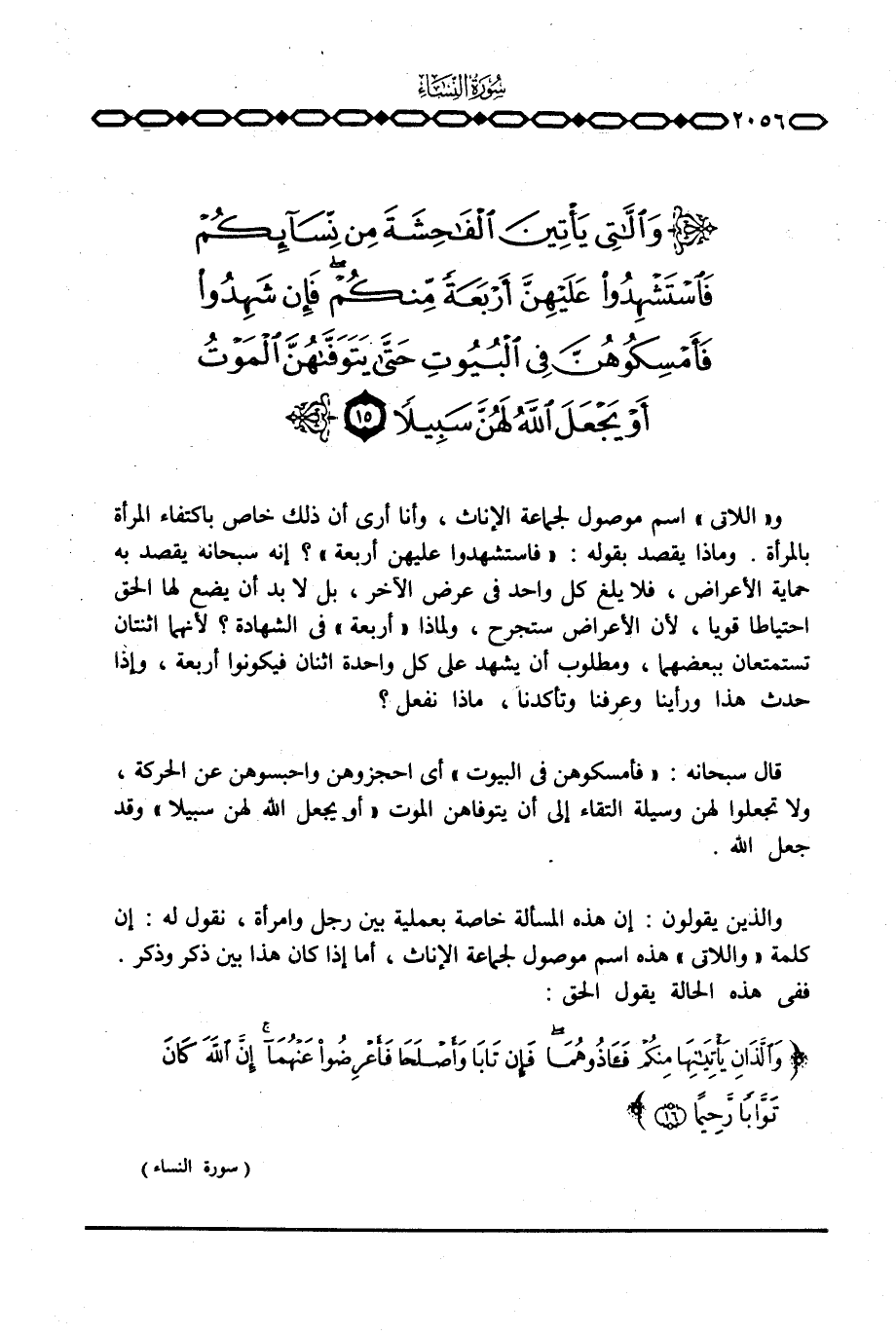 و {واللاتي} اسم موصول لجماعة الإناث، وأنا أرى أن ذلك خاص باكتفاء المرأة بالمرأة. وماذا يقصد بقوله: {فاستشهدوا عَلَيْهِنَّ أَرْبَعةً} ؟ إنه سبحانه يقصد به حماية الأعراض، فلا يبلغ كل واحد في عرض الآخر، بل لا بد أن يضع لها الحق احتياطا قويا، لأن الأعراض ستجرح، ولماذا «أربعة» في الشهادة؟ لأنهما اثنتان تستمتعان ببعضهما، ومطلوب أن يشهد على كل واحدة اثنان فيكونوا أربعة، وإذا حدث هذا ورأينا وعرفنا وتأكدنا، ماذا نفعل؟