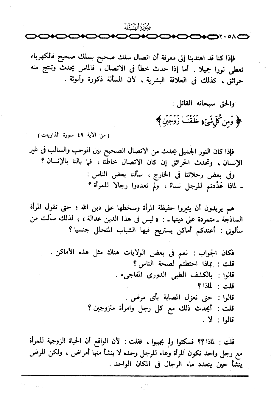 فإذا كنا قد اهتدينا إلى معرفة أن اتصال سلك صحيح بسلك صحيح فالكهرباء تعطي نورا جميلا. أما إذا حدث خطأ في الاتصال، فالماس يحدث وتنتج منه حرائق، كذلك في العلاقة البشرية، لأن المسألة ذكورة وأنوثة.