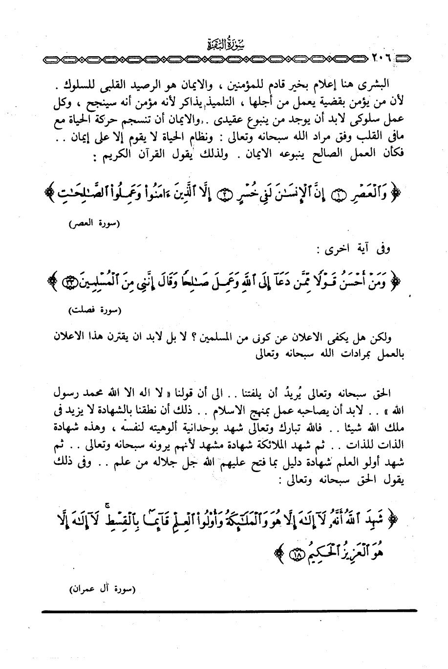 الحق سبحانه وتعالى يُريدُ أن يلفتنا. . إلى أن قولنا «لا إله إلا الله محمد رسول الله» . . لابد أن يصاحبه عمل بمنهج الإسلام. . ذلك أن نطقنا بالشهادة لا يزيد في ملك الله شيئا. . فالله تبارك وتعالى شهد بوحدانية ألوهيته لنفسه، وهذه شهادة الذات للذات. . ثم شهد الملائكة شهادة مشهد لأنهم يرونه سبحانه وتعالى. . ثم شهد أولو العلم شهادة دليل بما فتح عليهم الله جل جلاله من علم. . وفي ذلك يقول الحق سبحانه وتعالى: {شَهِدَ الله أَنَّهُ لاَ إله إِلاَّ هُوَ والملائكة وَأُوْلُواْ العلم قَآئِمَاً بالقسط لاَ إله إِلاَّ هُوَ العزيز الحكيم} [آل عمران: 18]