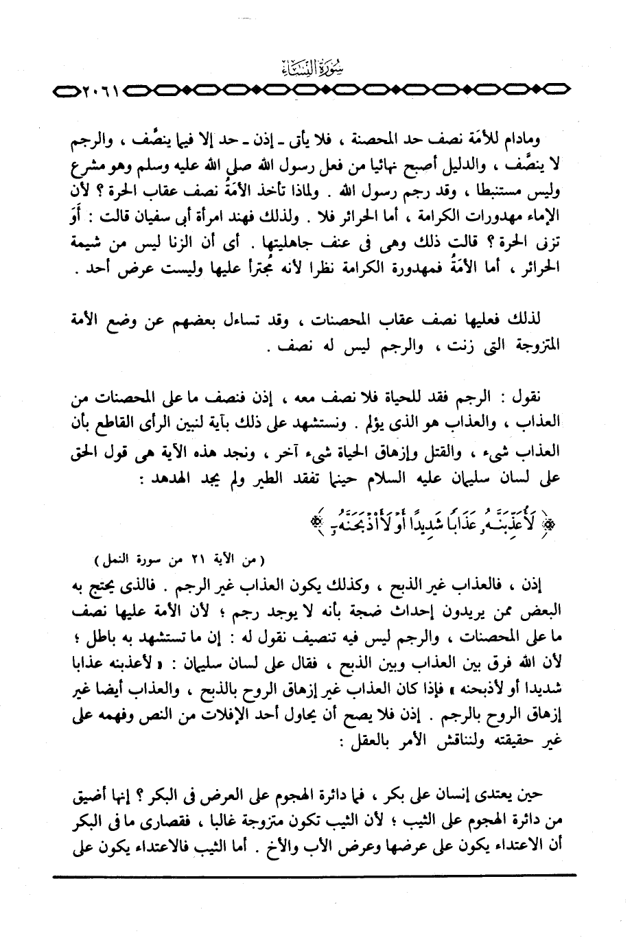 نقول: الرجم فقد للحياة فلا نصف معه، إذن فنصف ما على المحصنات من العذاب، والعذاب هو الذي يؤلم. ونستشهد على ذلك بآية لنبين الرأي القاطع بأن العذاب شيء، والقتل وإزهاق الحياة شيء آخر، ونجد هذه الآية هي قول الحق على لسان سليمان عليه السلام حينما تفقد الطير ولم يجد الهدهد: