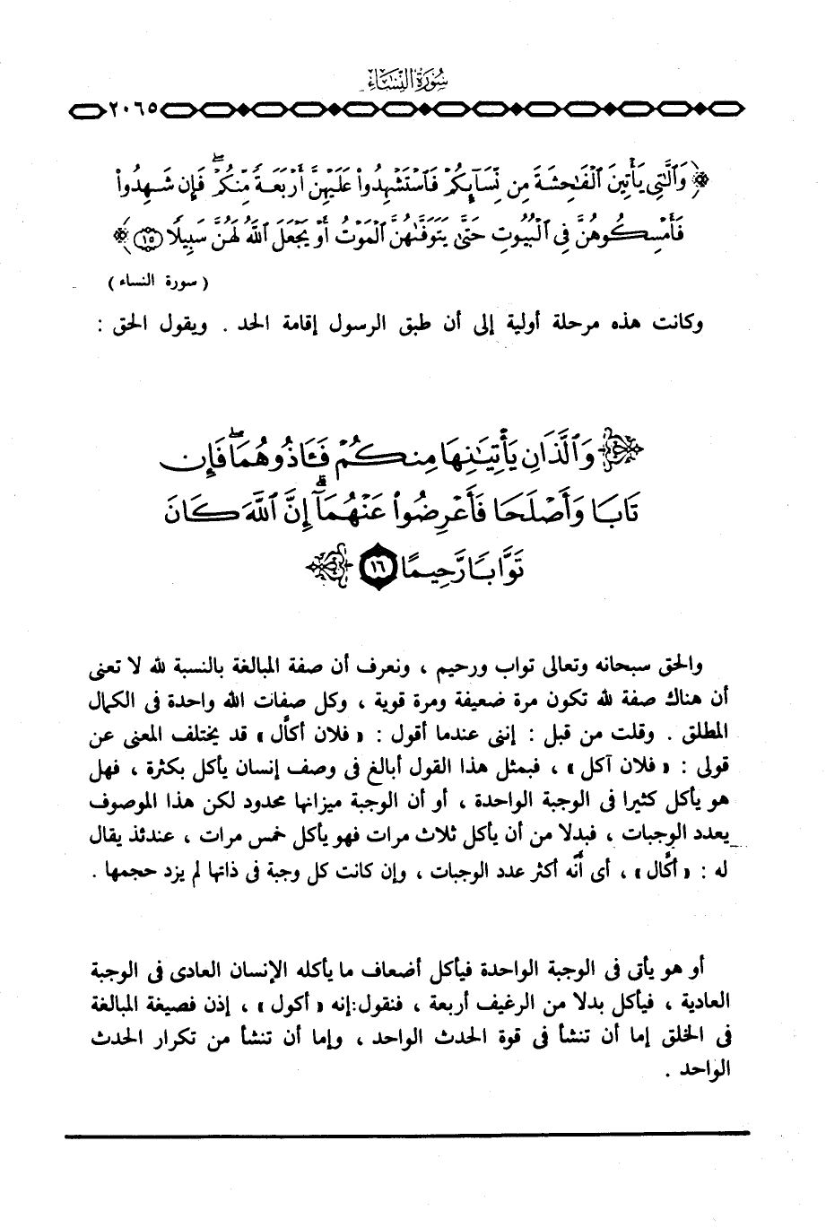 والحق سبحانه وتعالى تواب ورحيم، ونعرف أن صفة المبالغة بالنسبة لله لا تعني أن هناك صفة لله تكون مرة ضعيفة ومرة قوية، وكل صفات الله واحدة في الكمال المطلق. وقلت من قبل: إنني عندما أقول: «فلان أكاَّل» قد يختلف المعنى عن قولي: «فلان آكل» ، فبمثل هذا القول أبالغ في وصف إنسان يأكل بكثرة، فهل هو يأكل كثيرا في الوجبة الواحدة، أو أن الوجبة ميزانها محدود لكن هذا الموصوف يعدد الوجبات، فبدلا من أن يأكل ثلاث مرات فهو يأكل خمس مرات، عندئذ يقال له: «أكَّال» ، أي أّنّه أكثر عدد الوجبات، وإن كانت كل وجبة في ذاتها لم يزد حجمها.