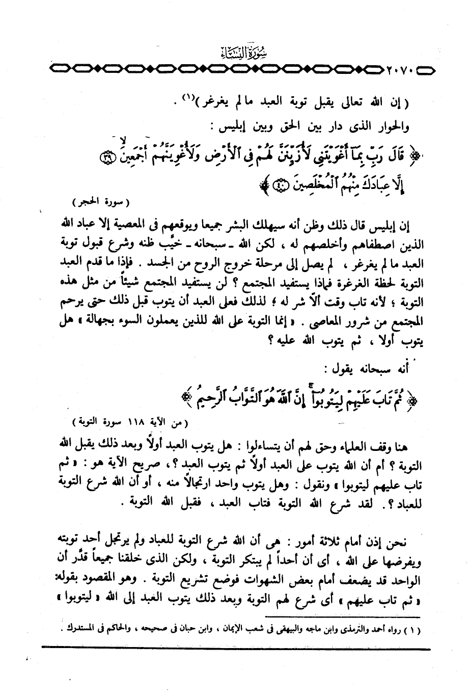 إن إبليس قال ذلك وظن أنه سيهلك البشر جميعا ويوقعهم في المعصية إلا عباد الله الذين اصطفاهم وأخلصهم له، لكن الله - سبحانه - خيَّب ظنه وشرع قبول توبة العبد ما لم يغرغر، لم يصل إلى مرحلة خروج الروح من الجسد. فإذا ما قدم العبد التوبة لحظة الغرغرة فماذا يستفيد المجتمع؟ لن يستفيد المجتمع شيئاً من مثل هذه التوبة؛ لأنه تاب وقت ألاّ شر له؛ لذلك فعلى العبد أن يتوب قبل ذلك حتى يرحم المجتمع من شرور المعاصي. {إِنَّمَا التوبة عَلَى الله لِلَّذِينَ يَعْمَلُونَ السواء بِجَهَالَةٍ} هل يتوب أولا، ثم يتوب الله عليه؟