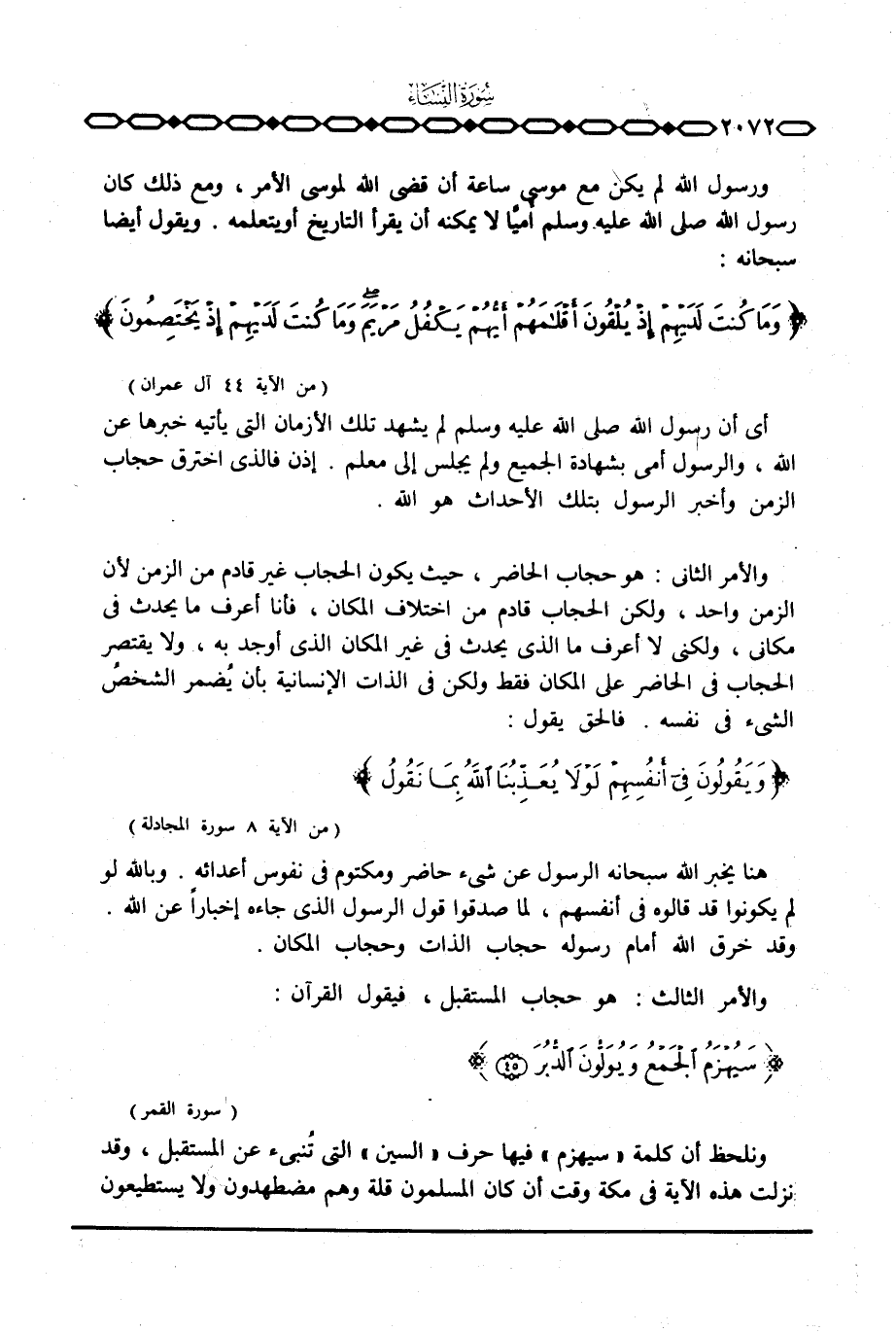 ورسول الله لم يكن مع موسى ساعة أن قضى الله لموسى الأمر، ومع ذلك كان رسول الله صَلَّى اللَّهُ عَلَيْهِ وَسَلَّم َ أميّاً لا يمكنه أن يقرأ التاريخ أو يتعلمه. ويقول أيضاً سبحانه: {وَمَا كُنتَ لَدَيْهِمْ إِذْ يُلْقُون أَقْلاَمَهُمْ أَيُّهُمْ يَكْفُلُ مَرْيَمَ وَمَا كُنْتَ لَدَيْهِمْ إِذْ يَخْتَصِمُونَ} [آل عمران: 44] .