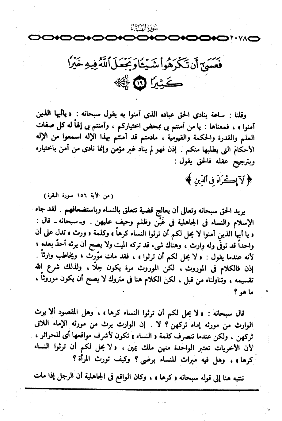 قال سبحانه: {لاَ يَحِلُّ لَكُمْ أَن تَرِثُواْ النسآء كَرْهاً} ، وهل المقصود ألا يرث الوارث من مورثه إماء تركهن؟ لا. إن الوارث يرث من مورثه الإماء اللاتي تركهن، ولكن عندما تنصرف كلمة «النساء» تكون لأشرف مواقعها أي للحرائر، لأن الأخريات تعتبر الواحدة منهن ملك يمين، {لاَ يَحِلُّ لَكُمْ أَن تَرِثُواْ النسآء كَرْهاً} ، وهل فيه ميراث للنساء برضى؟ وكيف تورث المرأة؟