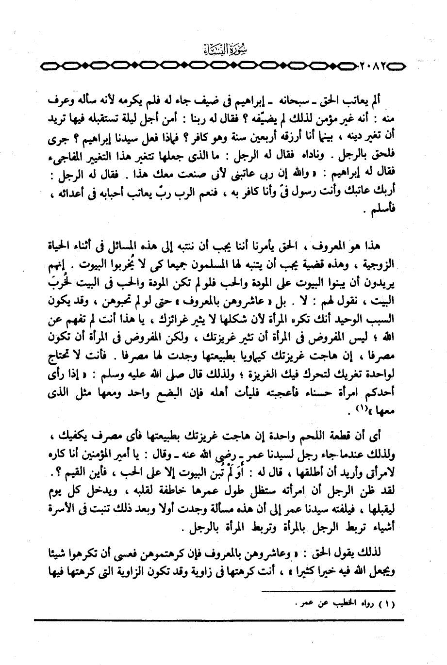 إنهم يريدون أن يبنوا البيوت على المودة والحب فلو لم تكن المودة والحب في البيت لخُربَ البيت، نقول لهم: لا. بل {وَعَاشِرُوهُنَّ بالمعروف} حتى لو لم تحبوهن، وقد يكون السبب الوحيد أنك تكره المرأة لأن شكلها لا يثير غرائزك، يا هذا أنت لم تفهم عن الله؛ ليس المفروض في المرأة أن تثير غريزتك، ولكن المفروض في المرأة أن تكون مصرفا، إن هاجت غريزتك كيماويا بطبيعتها وجدت لها مصرفا. فأنت لا تحتاج لواحدة تغريك لتحرك فيك الغريزة؛ ولذلك قال صَلَّى اللَّهُ عَلَيْهِ وَسَلَّم َ: «إذا رأى أحدكم امرأة حسناء فأعجبته فليأت أهله فإن البضع واحد ومعها مثل الذي معها» .