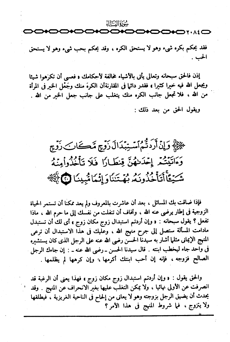 فإذا ضاقت بك المسائل، بعد أن عاشرت بالمعروف ولم يعد ممكنا أن تستمر الحياة الزوجية في إطار يرضى عنه الله، وتخاف أن تنفلت من نفسك إلى ما حرم الله، ماذا تفعل؟ يقول سبحانه: {وَإِنْ أَرَدْتُّمُ استبدال زَوْجٍ مَّكَانَ زَوْجٍ} أي لك أن تستبدل ما دامت المسألة ستصل إلى جرح منهج الله، وعليك في هذا الاستبدال أن ترعى المنهج الإيماني مثلما أشار به سيدنا الحسن رَضِيَ اللَّهُ عَنْه على الرجل الذي كان يستشيره في واحد جاء ليخطب ابنته. قال سيدنا الحسن - رَضِيَ اللَّهُ عَنْه -: إن جاءك الرجل الصالح فزوجه، فإنه إن أحب ابنتك أكرمها، وإن كرهها لم يظلمها.