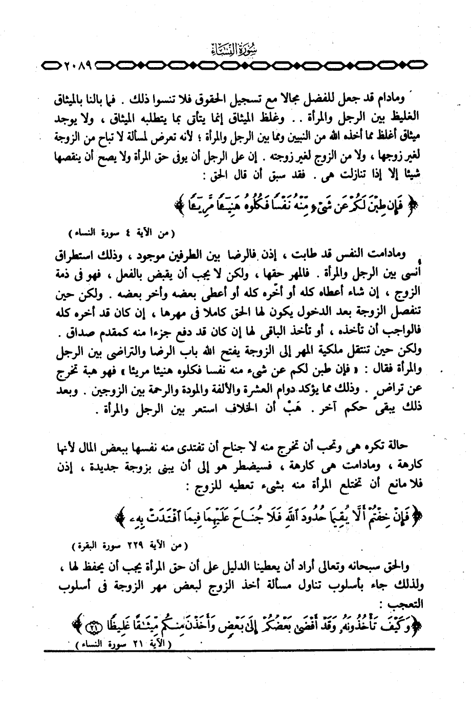 وما دام قد جعل للفضل مجالا مع تسجيل الحقوق فلا تنسوا ذلك. فما بالنا بالميثاق الغليظ بين الرجل والمرأة. . وغلظ الميثاق إنما يتأتى بما يتطلبه الميثاق، ولا يوجد ميثاق أغلظ مما أخذه الله من النبيين ومما بين الرجل والمرأة؛ لأنه تعرض لمسألة لا تباح من الزوجة لغير زوجها، ولا من الزوج لغير زوجته. إن على الرجل أن يوفى حق المرأة ولا يصح أن ينقصها شيئا إلا إذا تنازلت هي. فقد سبق أن قال الحق: {فَإِن طِبْنَ لَكُمْ عَن شَيْءٍ مِّنْهُ نَفْساً فَكُلُوهُ هَنِيئاً مَّرِيئاً} [النساء: 4] .