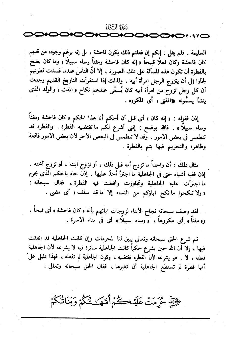 السليمة. فلم يقل: إنكم إن فعلتم ذلك يكون فاحشة، بل إنه برغم وجوده من قديم كان فاحشة وكان فعلاً قبيحاً {إِنَّهُ كَانَ فَاحِشَةً وَمَقْتاً وَسَآءَ سَبِيلاً} وما كان يصح بالفطرة أن تكون هذه المسألة على تلك الصورة، إلا أنّ الناس عندما فسدت فطرتهم لجأوا إلى أن يتزوج الرجل امرأة أبيه، ولذلك إذا استقرأت التاريخ القديم وجدت أن كل رجل تزوج من امرأة أبيه كان يُسمَّى عندهم نكاح «المقت» والولد الذي ينشأ يسمُّونه «المقتي» أي المكروه.