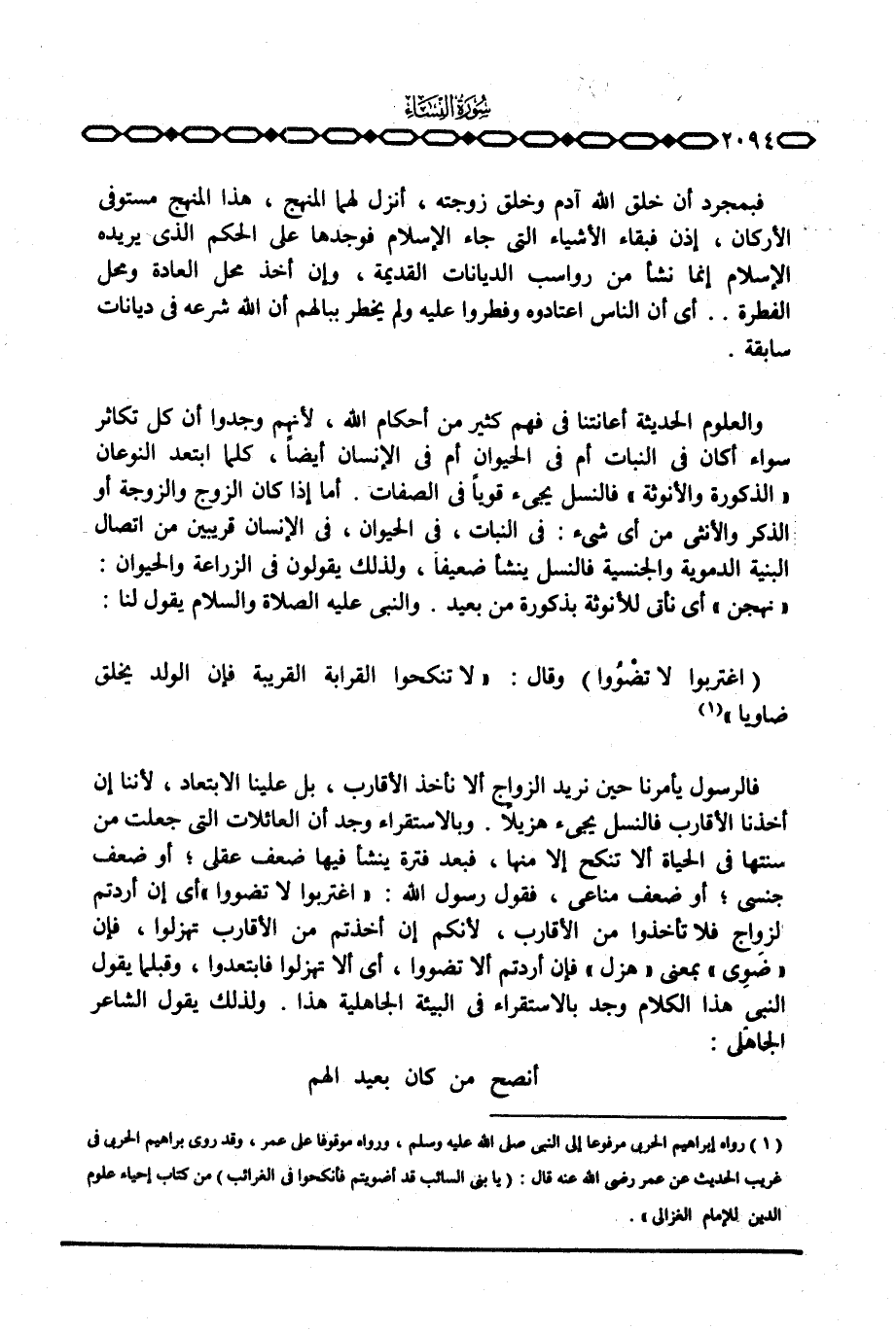 والعلوم الحديثة أعانتنا في فهم كثير من أحكام الله، لأنهم وجدوا أن كل تكاثر سواء أكان في النبات أم في الحيوان أم في الإنسان أيضاً، كلما ابتعد النوعان «الذكورة والأنوثة» فالنسل يجيء قوياً في الصفات. أما إذا كان الزوج والزوجة أو الذكر والأنثى من أي شيء: في النبات، في الحيوان، في الإنسان قريبين من اتصال البنية الدموية والجنسية فالنسل ينشأ ضعيفاً، ولذلك يقولون في الزراعة والحيوان: «نهجن» أي نأتي للأنوثة بذكورة من بعيد. والنبي عَلَيْهِ الصَّلَاة وَالسَّلَام ُ يقول لنا: