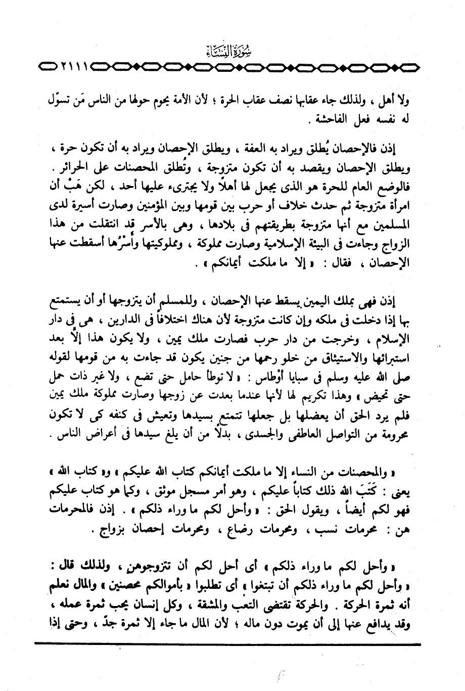 إذن فالإحصان يُطلق ويراد به العفة، ويطلق الإحصان ويراد به أن تكون حرة، ويطلق الإحصان ويقصد به أن تكون متزوجة، وتُطلق المحصنات على الحرائر. فالوضع العام للحرة هو الذي يجعل لها أهلاً ولا يجترئ عليها أحد، لكن هَبْ أن امرأة متزوجة ثم حدث خلاف أو حرب بين قومها وبين المؤمنين وصارت أسيرة لدى المسلمين مع أنها متزوجة بطريقتهم في بلادها، وهي بالأسر قد انتقلت من هذا الزواج وجاءت في البيئة الإسلامية وصارت مملوكة، ومملوكيتها وأَسْرُها أسقطت عنها الإحصان، فقال: {إِلاَّ مَا مَلَكْتَ أَيْمَانُكُمْ} .