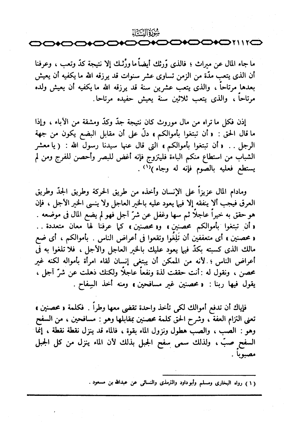 فإياك أن تدفع أموالك لكي تأخذ واحدة تقضي معها وطراً. فكلمة «محصنين» تعني التزام العفة، وشرح الحق كلمة محصنين بمقابلها وهو: مسافحين، من السفح وهو: الصب، والصب هطول ونزول الماء بقوة، فالماء قد ينزل نقطة نقطة، إنما السفح صبّ، ولذلك سمي سفح الجبل بذلك لأن الماء ينزل من كل الجبل مصبوباً.