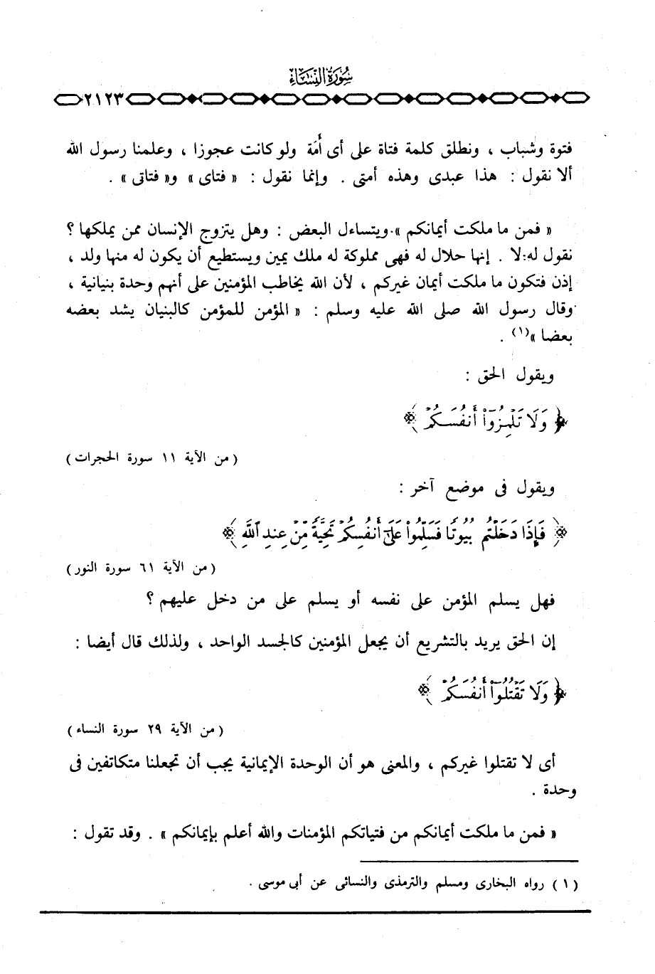 {فَمِنْ مَّا مَلَكَتْ أَيْمَانُكُم} ويتساءل البعض: وهل يتزوج الإنسان ممن يملكها؟ نقول له: لا. إنها حلال له فهي مملوكة له ملك يمين ويستطيع أن يكون له منها ولد، إذن فتكون ما ملكت أيمان غيركم، لأن الله يخاطب المؤمنين على أنهم وحدة بنيانية، وقال رسول الله عليه السلام: «المؤمن للمؤمن كالبنيان يشد بعضه بعضا» .