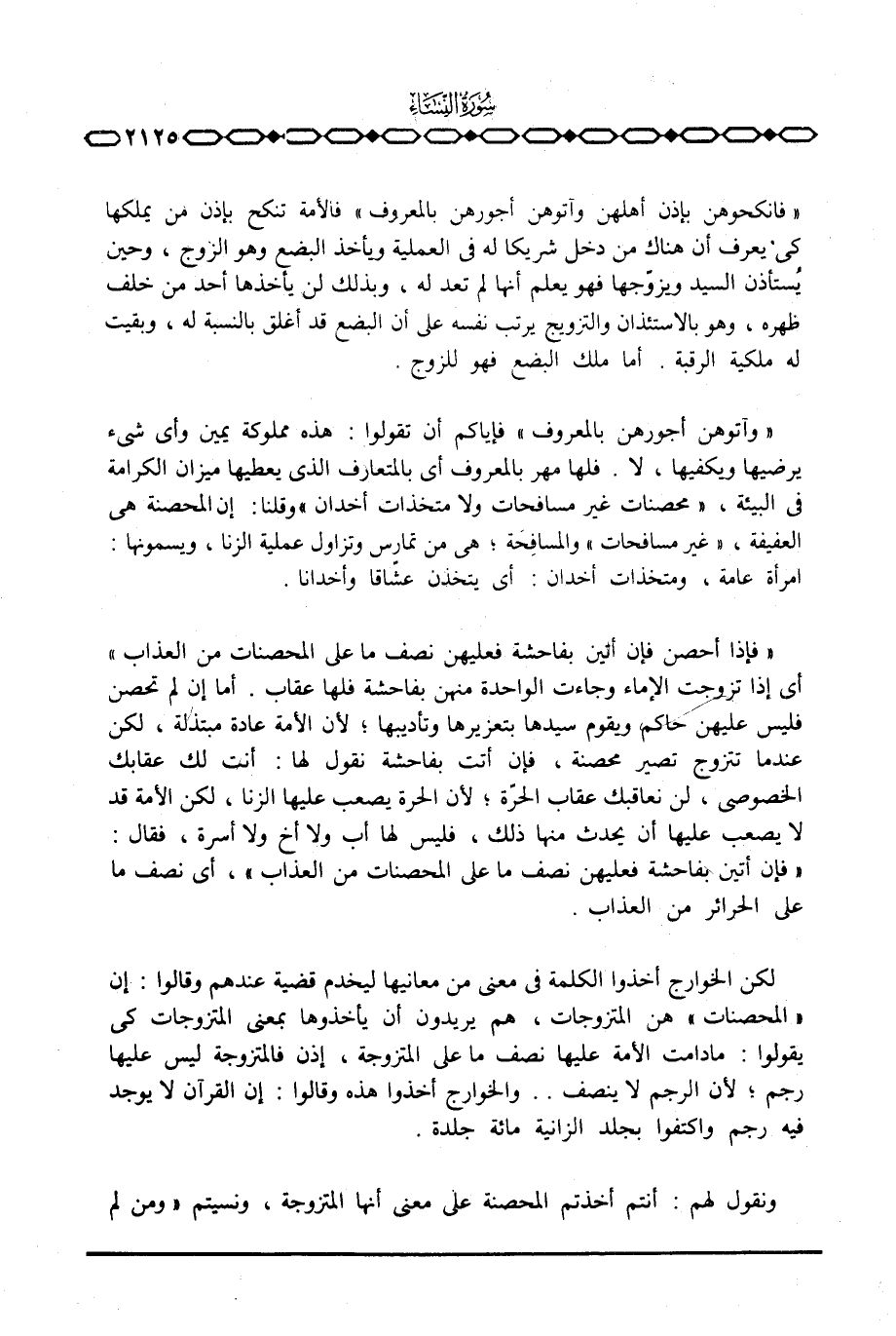 {فانكحوهن بِإِذْنِ أَهْلِهِنَّ وَآتُوهُنَّ أُجُورَهُنَّ بالمعروف} فالأمة تنكح بإذن من يملكها كي يعرف أن هناك من دخل شريكا له في العملية ويأخذ البضع وهو الزوج، وحين يُستأذن السيد ويزوّجها فهو يعلم أنها لم تعد له، وبذلك لن يأخذها أحد من خلف ظهره، وهو بالاستئذان والتزويج يرتب نفسه على أن البضع قد أغلق بالنسبة له، وبقيت له ملكية الرقبة. أما ملك البضع فهو للزوج.