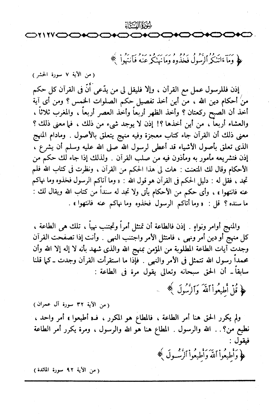 إذن فللرسول عمل مع القرآن، وإلا فليقل لي من يدّعي أنّ في القرآن كل حكم من أحكام دين الله، من أين أخذ تفصيل حكم الصلوات الخمس؟ ومن أي آية أخذ أن الصبح ركعتان؟ وأخذ الظهر أربعاً وأخذ العصر أربعاً، والمغرب ثلاثاً، والعشاء أربعاً، من أين أخذها؟! إذن لا يوجد شيء من ذلك، فما معنى ذلك؟ معنى ذلك أن القرآن جاء كتاب معجزة وفيه منهج يتعلق بالأصول. وما دام المنهج الذي تعلق بأصول الأشياء قد أعطى لرسول الله صَلَّى اللَّهُ عَلَيْهِ وَسَلَّم َ أن يشرع، إذن فتشريعه مأمور به ومأذون فيه من صلب القرآن. ولذلك إذا جاء لك حكم من الأحكام وقال لك المتعنت: هات لي هذا الحكم من القرآن، ونظرت في كتاب الله فلم تجد، فقل له: دليل الحكم في القرآن هو قول الله: {وَمَآ آتَاكُمُ الرسول فَخُذُوهُ وَمَا نَهَاكُمْ عَنْهُ فانتهوا} ، وأي حكم من الأحكام يأتي ولا تجد له سنداً من كتاب الله ويقال لك: ما سنده؟ قل: {وَمَآ آتَاكُمُ الرسول فَخُذُوهُ وَمَا نَهَاكُمْ عَنْهُ فانتهوا} .