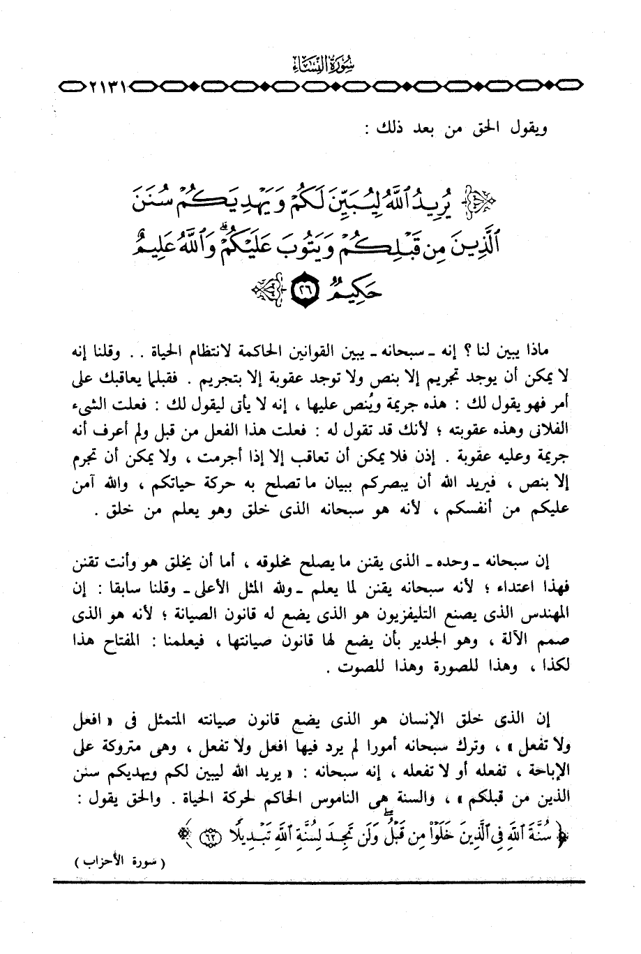 إن الذي خلق الإنسان هو الذي يضع قانون صيانته المتمثل في «افعل ولا تفعل» ، وترك سبحانه أمورا لم يرد فيها افعل ولا تفعل، وهي متروكة على الإباحة، تفعله أو لا تفعله، إنه سبحانه: {يُرِيدُ الله لِيُبَيِّنَ لَكُمْ وَيَهْدِيَكُمْ سُنَنَ الذين مِن قَبْلِكُمْ} ، والسنة هي الناموس الحاكم لحركة الحياة. والحق يقول: {سُنَّةَ الله فِي الذين خَلَوْاْ مِن قَبْلُ وَلَن تَجِدَ لِسُنَّةِ الله تَبْدِيلاً} [الأحزاب: 62] .