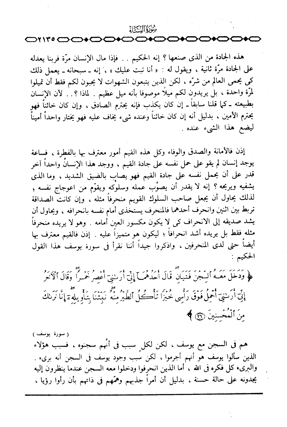 إذن فالأمانة والصدق والوفاء وكل هذه القيم أمور معترف بها بالفطرة، فساعة يوجد إنسان لم يقو على حمل نفسه على جادة اليم، ووجد هذا الإنسان واحداً آخر قدر على أن يحمل نفسه على جادة القيم فهو يصاب بالضيق الشديد، وما الذي يشفيه ويريحه؟ إنه لا يقدر أن يصوِّب عمله وسلوكه ويقوّم من اعوجاج نفسه؛ لذلك يحاول أن يجعل صاحب السلوك القويم منحرفاً مثله، وإن كانت الصداقة تربط بين اثنين وانحراف أحدهما فالمنحرف يستخذي أمام نفسه بانحرافه، ويحاول أن يشد صديقه إلى الانحراف كي لا يكون مكسور العين أمامه. وهو لا يريده منحرفاً مثله فقط بل يريده أشد انحرافاً؛ ليكون هو متميزاً عليه. إذن فالقيم معترف بها أيضاً حتى لدى المنحرفين، واذكروا جيداً أننا نقرأ في سورة يوسف هذا القول الحكيم: {وَدَخَلَ مَعَهُ السجن فَتَيَانِ قَالَ أَحَدُهُمَآ إني أراني أَعْصِرُ خَمْراً وَقَالَ الآخر إِنِّي أراني أَحْمِلُ فَوْقَ رَأْسِي خُبْزاً تَأْكُلُ الطير مِنْهُ نَبِّئْنَا بِتَأْوِيلِهِ إِنَّا نَرَاكَ مِنَ المحسنين} [يوسف: 26] .