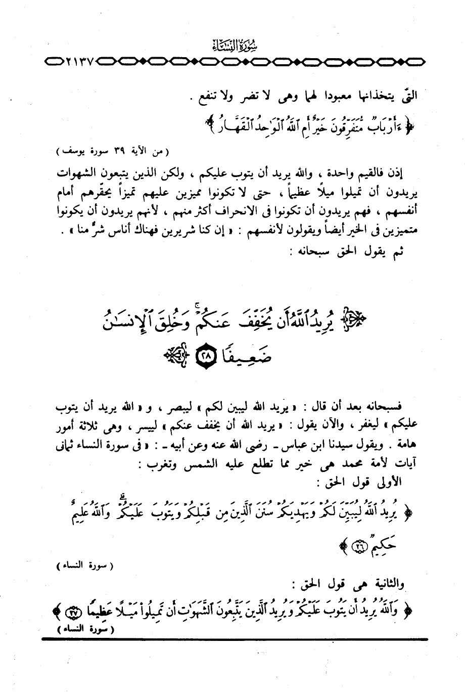 فسبحانه بعد أن قال: {يُرِيدُ الله لِيُبَيِّنَ لَكُمْ} ليبصر، و {يُرِيدُ أَن يَتُوبَ عَلَيْكُمْ} ليغفر، والآن يقول: {يُرِيدُ الله أَن يُخَفِّفَ عَنْكُمْ} ليسر، وهي ثلاثة أمور هامة. ويقول سيدنا ابن عباس - رَضِيَ اللَّهُ عَنْه وعن أبيه -: «في سورة النساء ثماني آيات لأمة محمد هي خير مما تطلع عليه الشمس وتغرب: