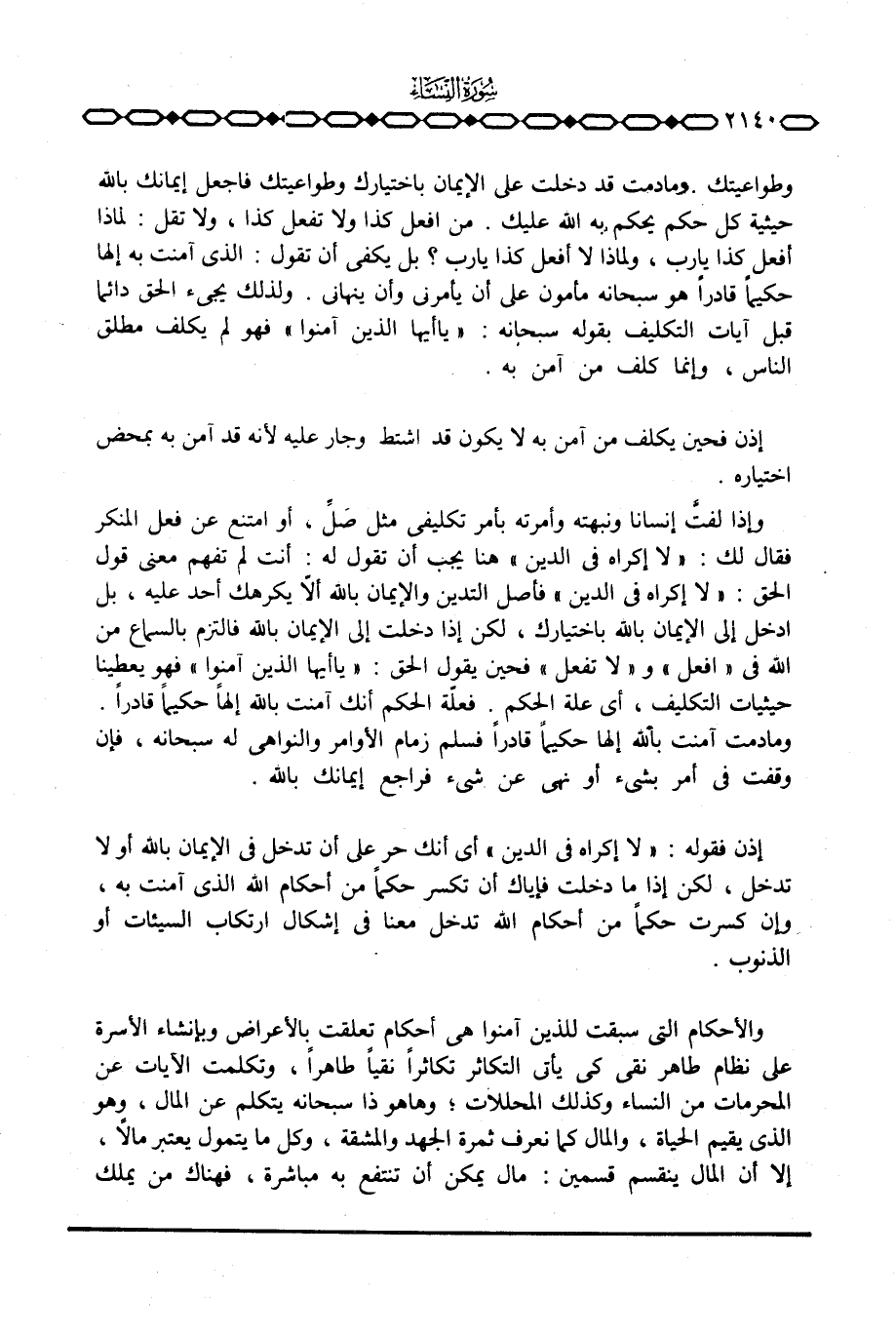 وإذا لفتَّ إنسانا ونبهته وأمرته بأمر تكليفي مثل صَلَّ، أو امتنع عن فعل المنكر فقال لك: {لاَ إِكْرَاهَ فِي الدين} هنا يجب أن تقول له: أنت لم تفهم معنى قول الحق: {لاَ إِكْرَاهَ فِي الدين} فأصل التدين والإيمان بالله ألاّ يكرهك أحد عليه، بل ادخل إلى الإيمان بالله باختيارك، لكن إذا دخلت إلى الإيمان بالله فالتزم بالسماع من الله في «افعل» و «لا تفعل» فحين يقول الحق: {يَا أَيُّهَا الذين آمَنُواْ} فهو يعطينا حيثيات التكليف، أي علة الحكم. فعلّة الحكم أنك آمنت بالله آلهاً حكيماً قادراً. وما دمت آمنت بالله إلهاً حكيماً قادراً فسلم زمام الأوامر والنواهي له سبحانه، فإن وقفت في أمر بشيء أو نهى عن شيء فراجع إيمانك بالله.