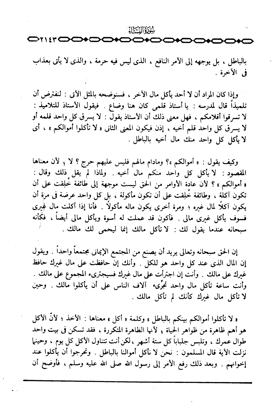 {لاَ تأكلوا أَمْوَالَكُمْ بَيْنَكُمْ بالباطل} وكلمة «أكل» معناها: الأخذ؛ لأنّ الأكل هو أهم ظاهرة من ظواهر الحياة؛ لأنها الظاهرة المتكررة، فقد تسكن في بيت واحد طوال عمركن وتلبس جلباباً كل ستة أشهر، ولكن أنت تتناول الأكل كل يوم، وحينما نزلت الآية قال المسلمون: نحن لا نأكل أموالنا بالباطل. وتحرجوا أن يأكلوا عند إخوانهم. وبعد ذلك رفع الأمر إلى رسول الله صَلَّى اللَّهُ عَلَيْهِ وَسَلَّم َ، فأوضح أن