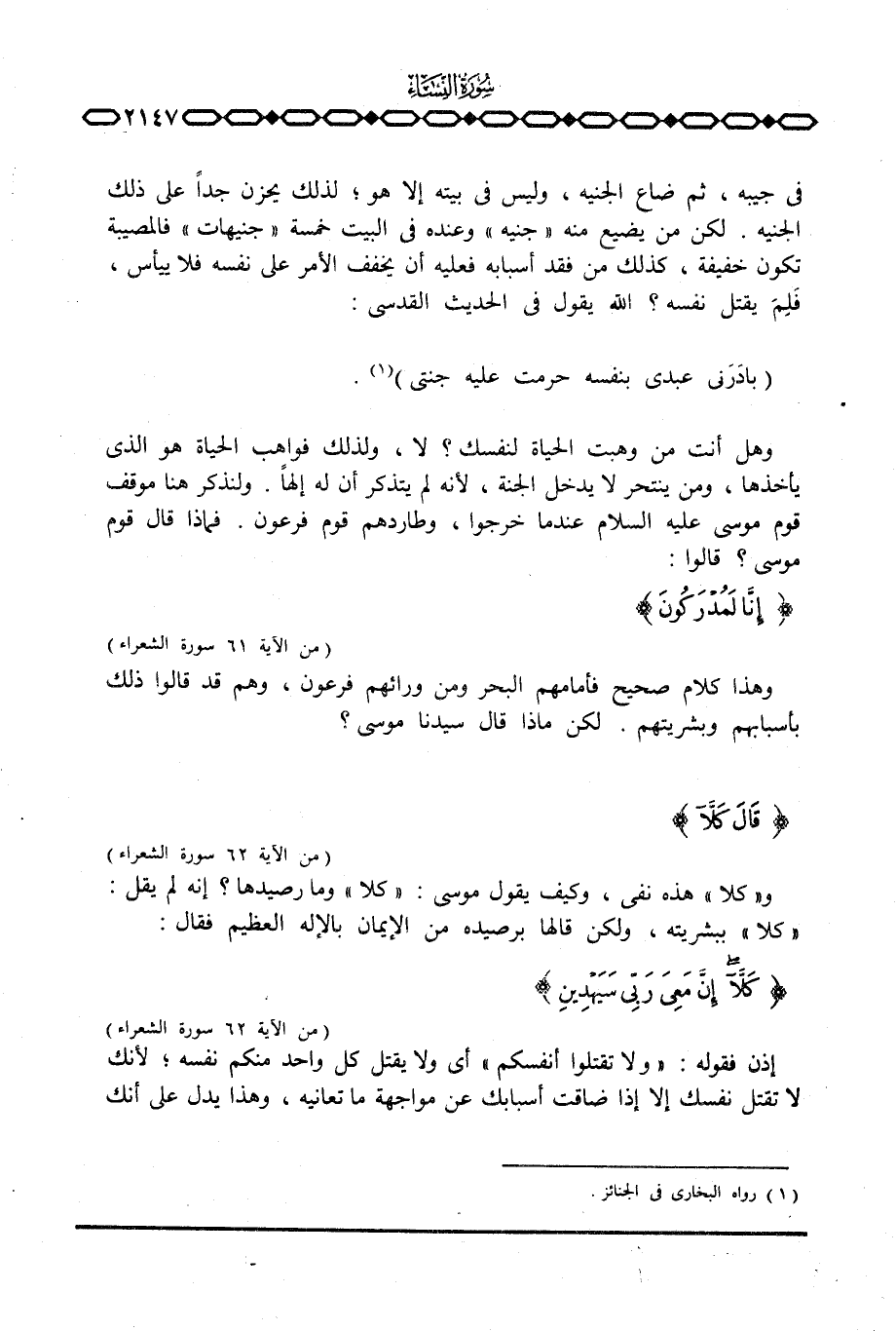 في جيبه، ثم ضاع الجنيه، وليس في بيته إلا هو؛ لذلك يحزن جداً على ذلك الجنيه. لكن من يضيع منه «جنيه» وعنده في البيت خمسة «جنيهات» فالمصيبة تكون خفيفة، كذلك من فقد أسبابه فعليه أن يخفف الأمر على نفسه فلا ييأس، فَلِمَ يقتل نفسه؟ الله يقول في الحديث القدسي: